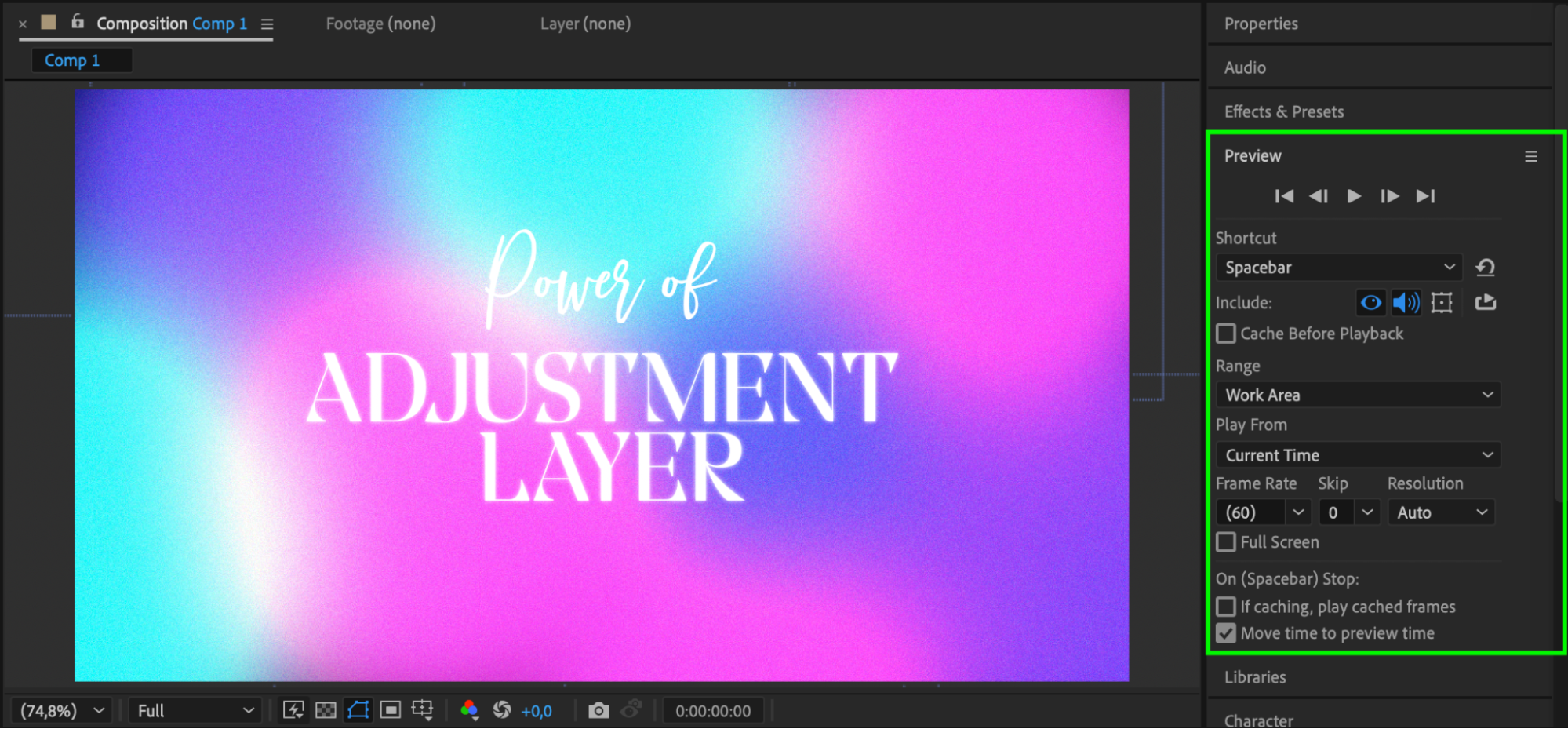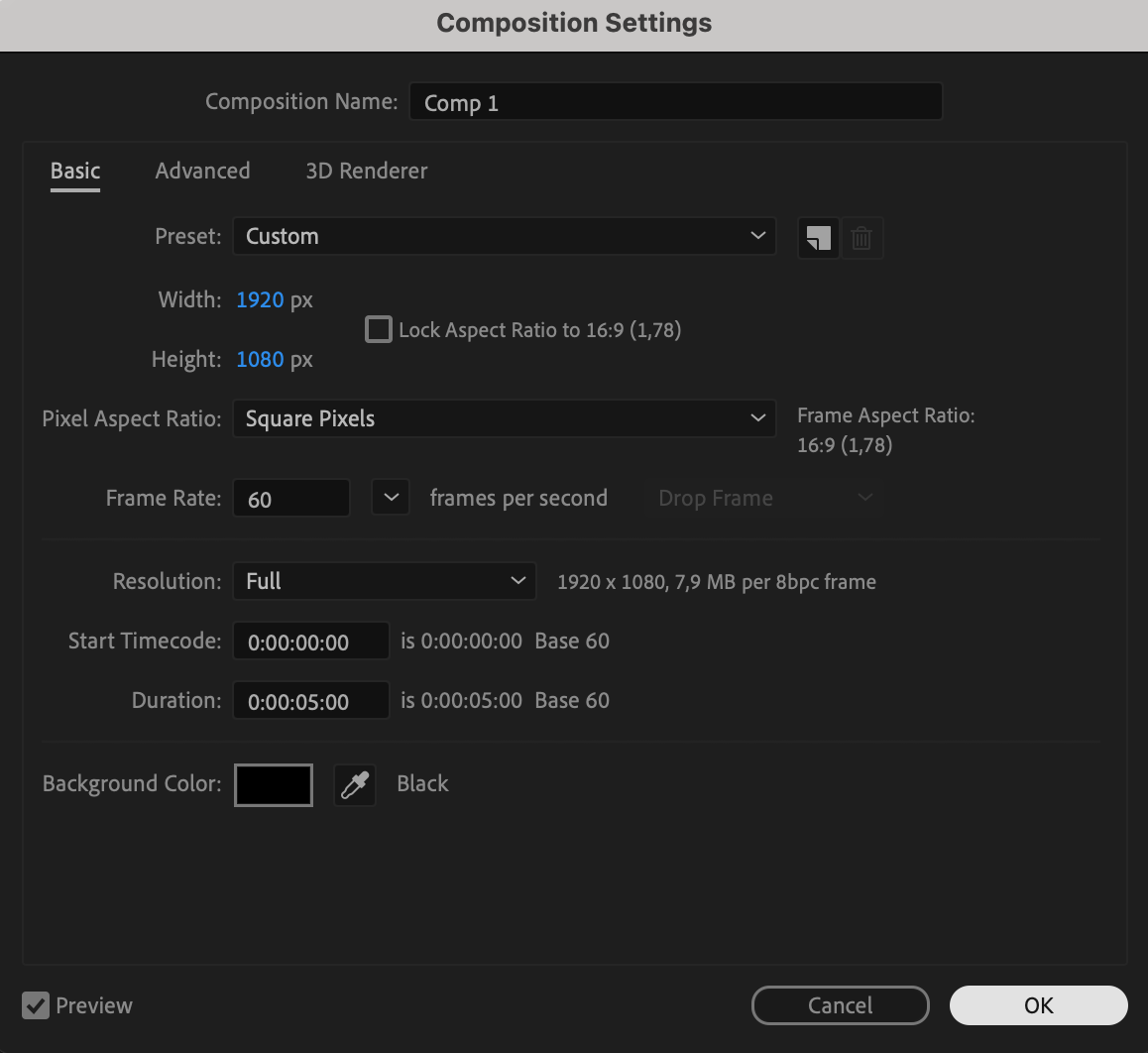 Start by going to Composition > New Composition. Set your preferred resolution (such as 1920×1080), frame rate, and duration. Choose a dark background color to help the glow effect stand out.