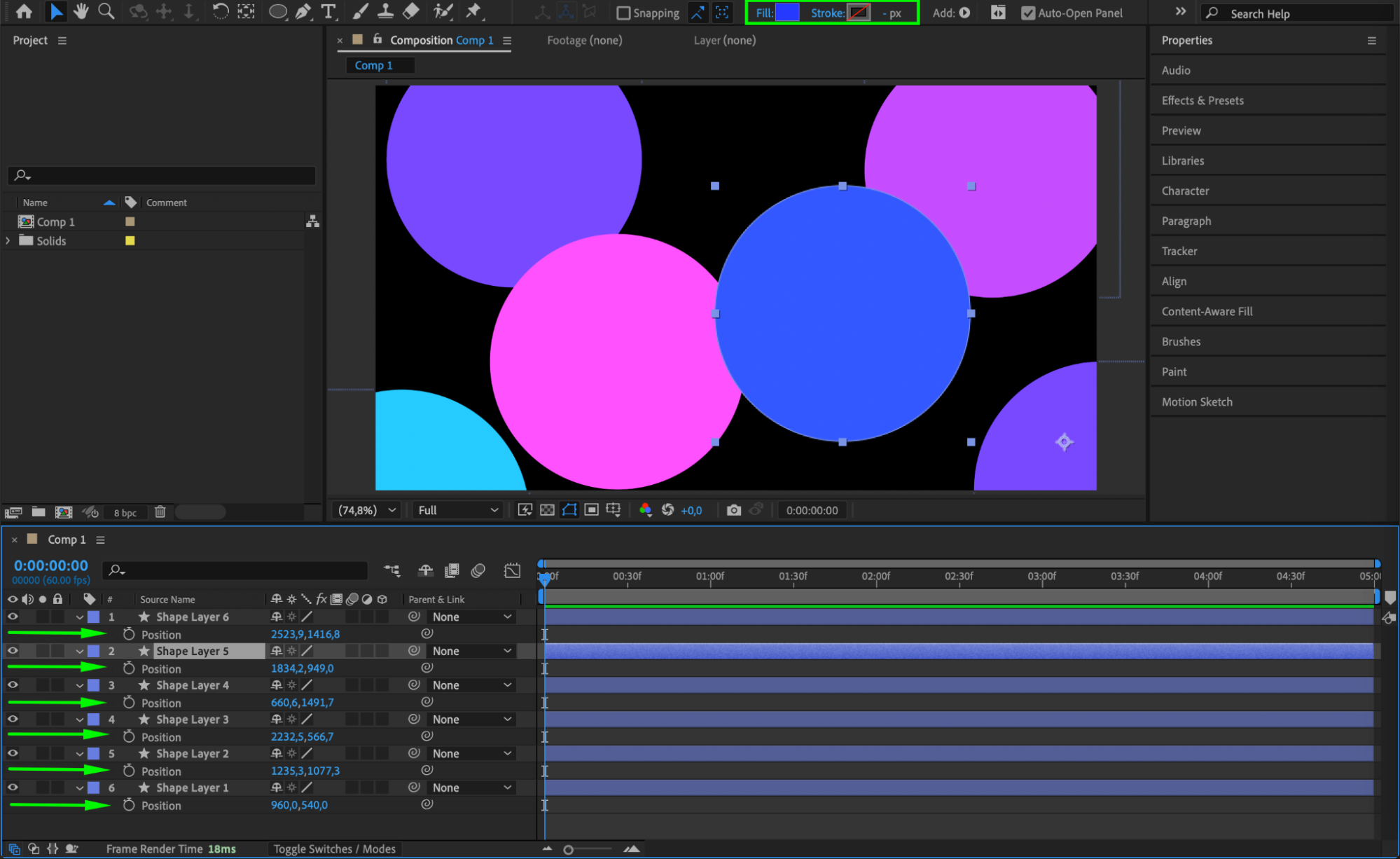 With the circle layer selected, press “Ctrl/Cmd + D” to duplicate it as many times as you like. Change the Fill color of each duplicate for variation and position them around the composition to create a more complex design.