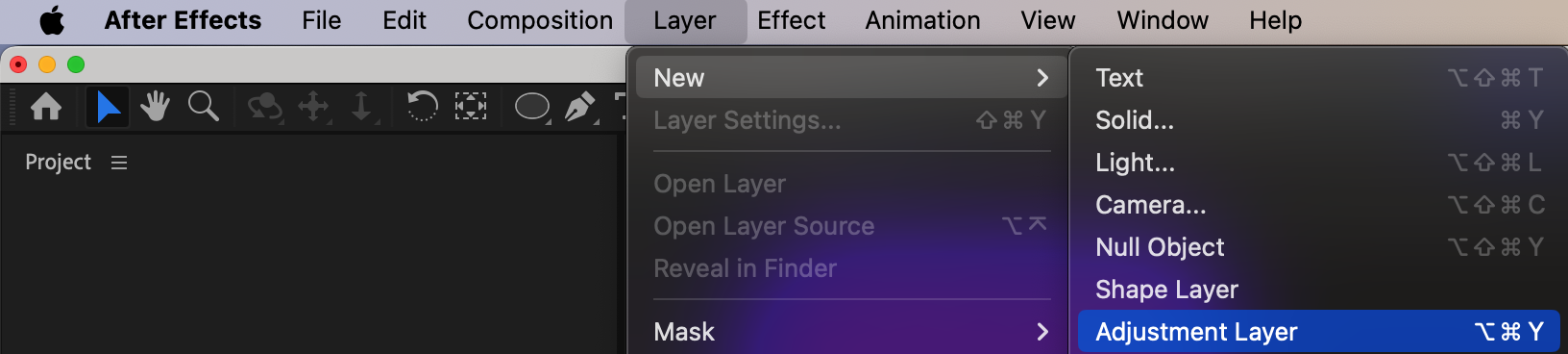 Go to Layer > New > Adjustment Layer. This layer will be used to apply effects that affect everything below it. Place it above all your shape layers in the timeline.