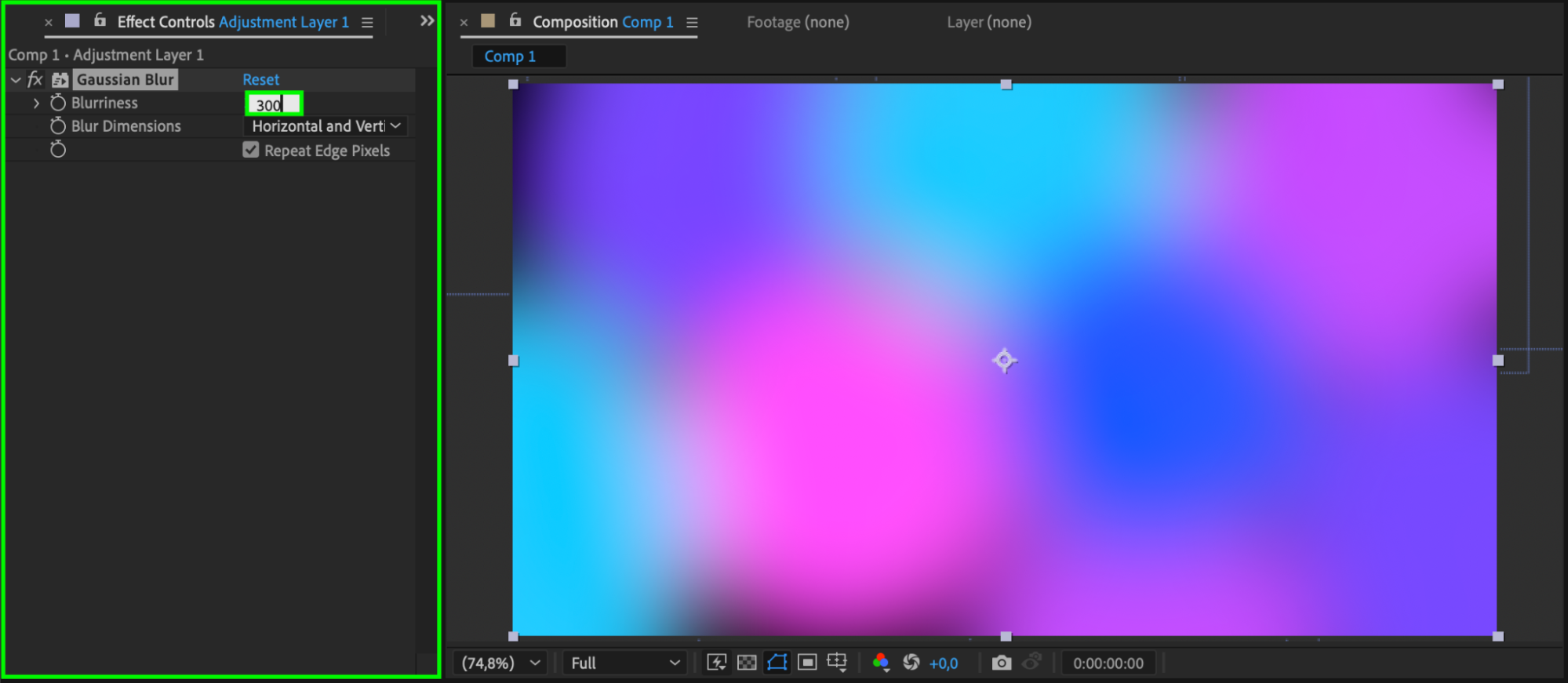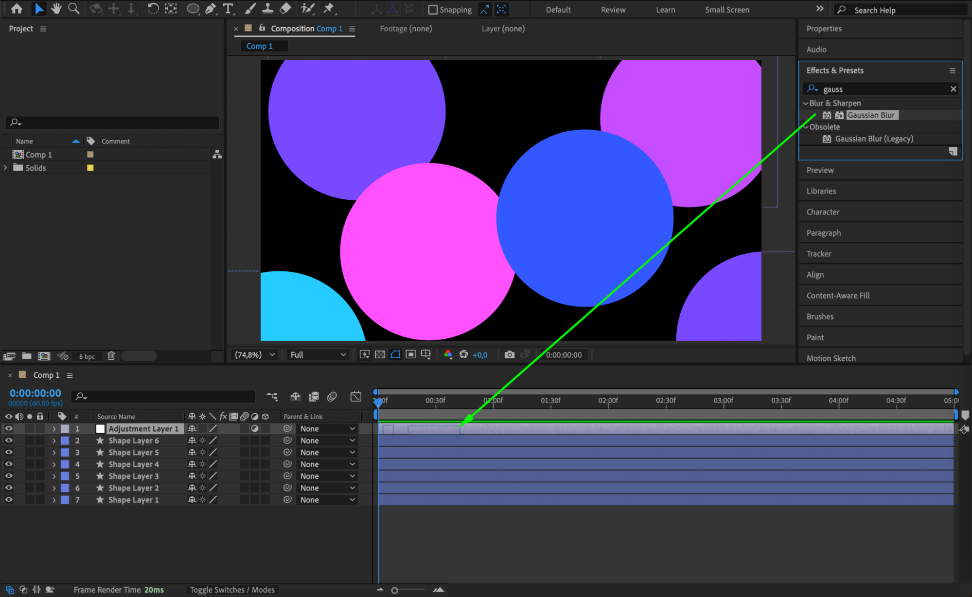 With the adjustment layer selected, go to Effects & Presets, search for Gaussian Blur, and apply it. Increase the Blurriness value to create a soft glow-like blur across your shapes.
