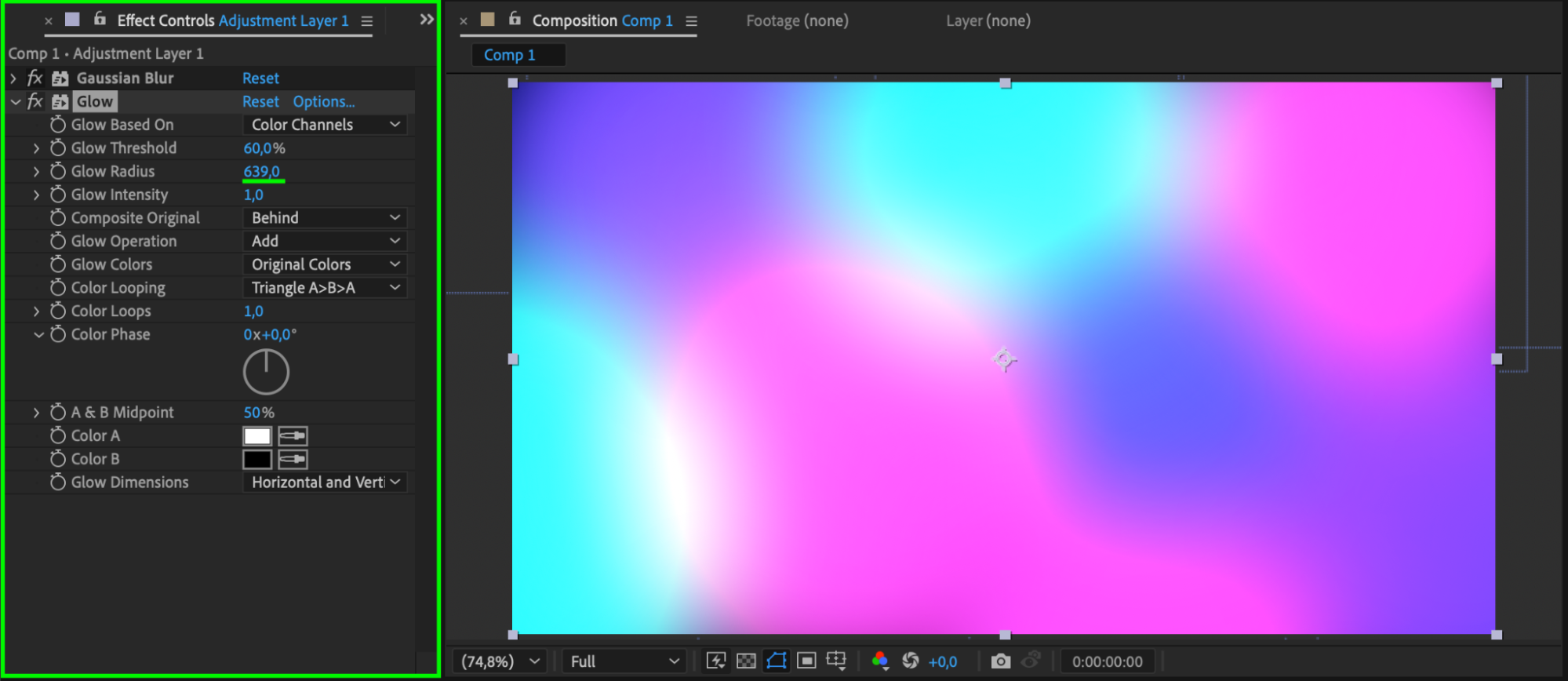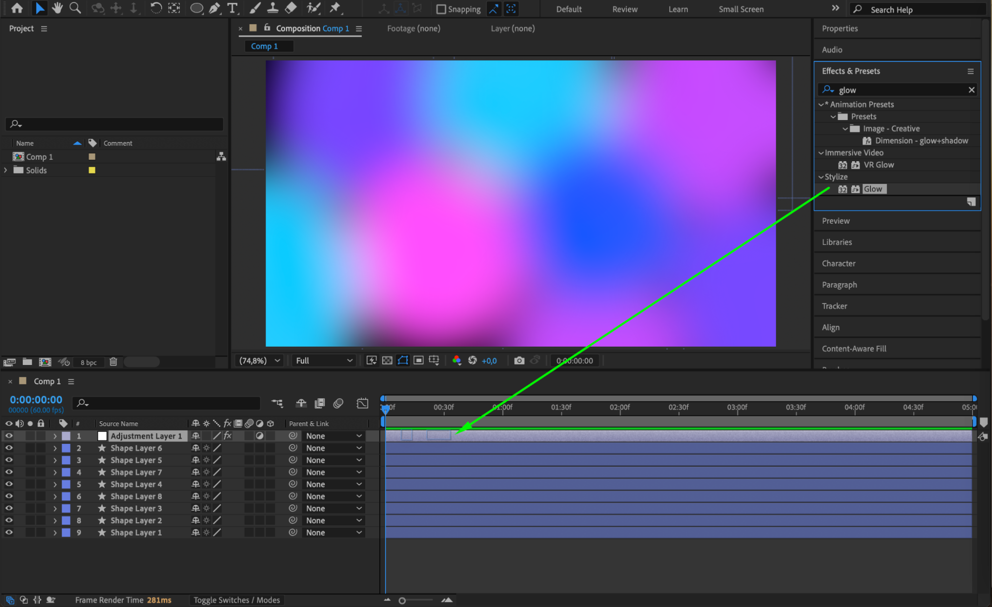 Next, apply the Glow effect to the same adjustment layer. This will give your shapes a glowing, stylized appearance. Adjust the Glow Radius, Glow Intensity, and Threshold until you get the desired effect.