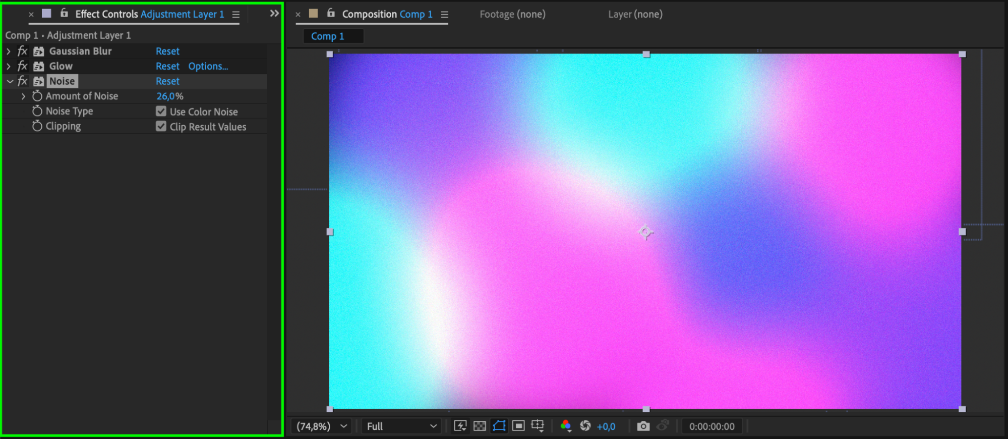 To make the effect more dynamic and cinematic, apply the Noise effect to the adjustment layer. Set the Amount of Noise to around 5–20% and enable Use Color Noise to avoid color banding.