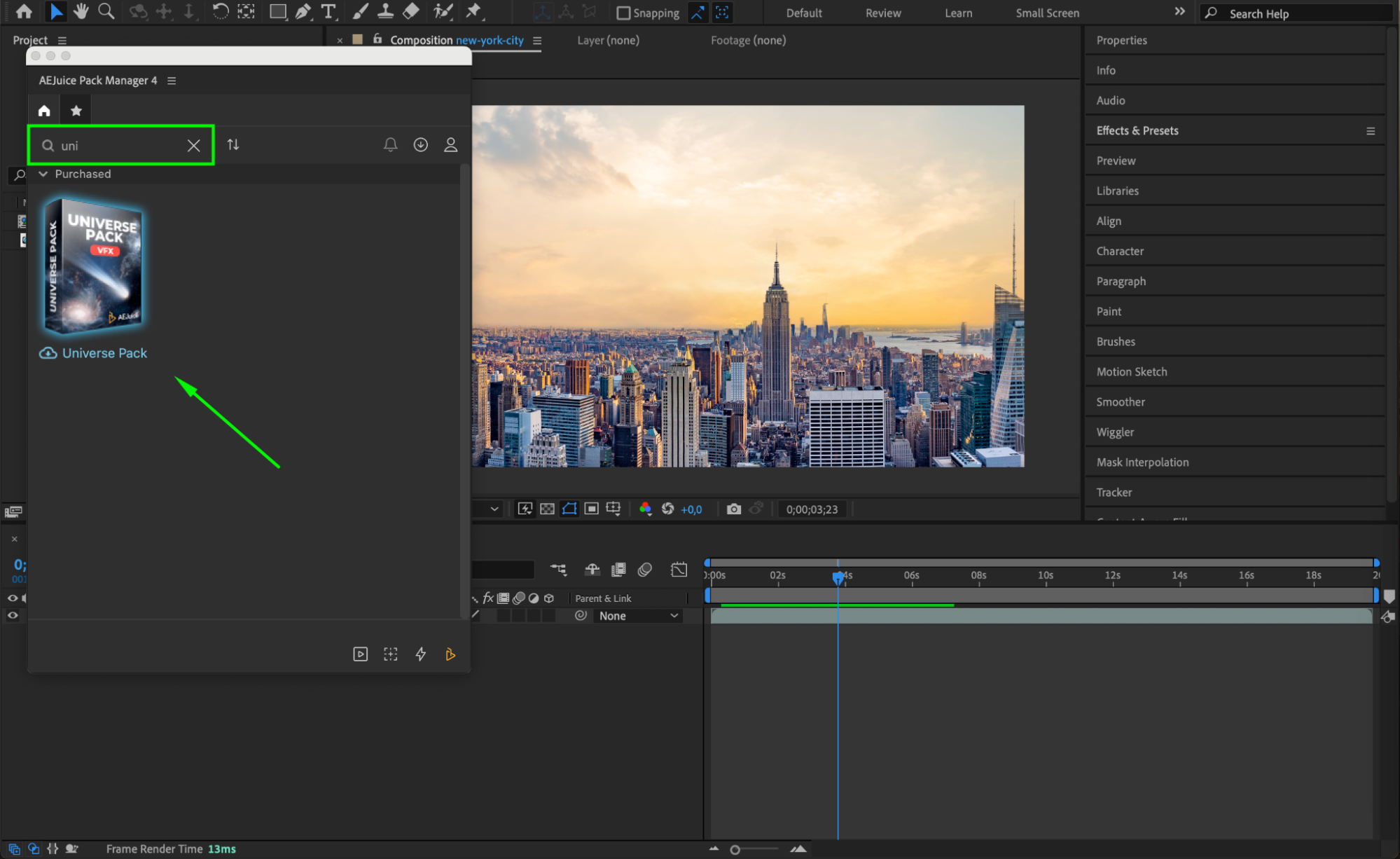 You can incorporate various VFX elements such as stock videos, 3D models, presets, or plugins like AEJuice. Add these elements as layers in the Timeline Panel. Adjust their scale, position, rotation, and opacity to fit seamlessly into your scene. This step involves integrating the VFX elements into your footage and positioning them accurately.