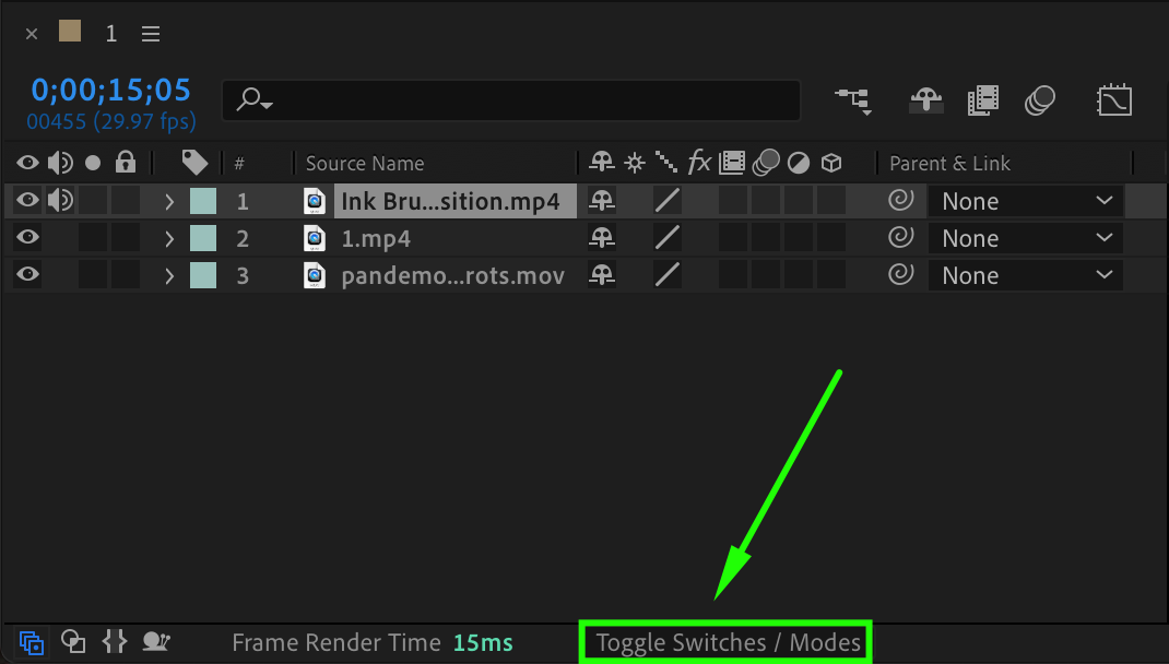 Click on Toggle Switches/Modes below the timeline to reveal the “TrkMat” column. For the first video layer, choose the stock transition layer as the Luma Matte. This will make the clip fade out based on the brightness of the transition.