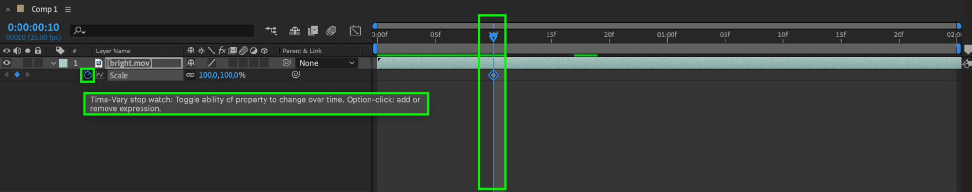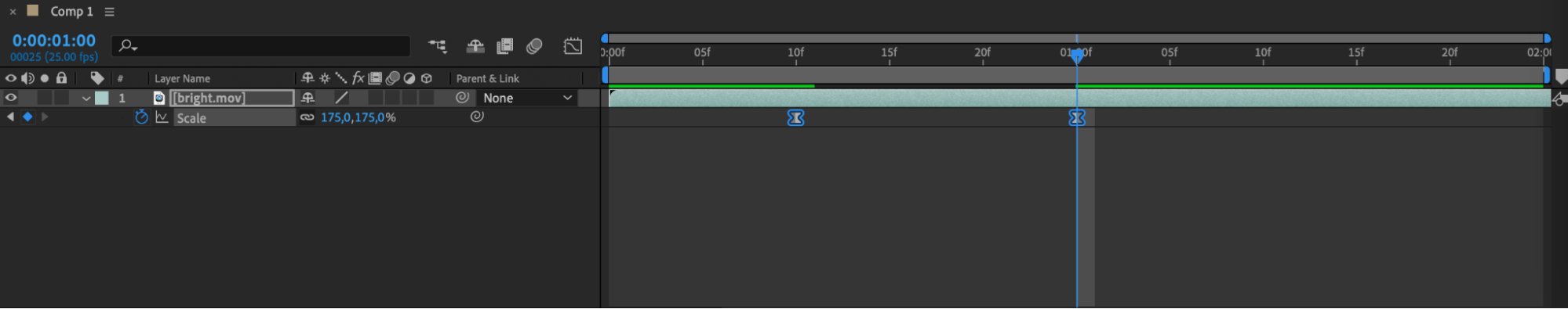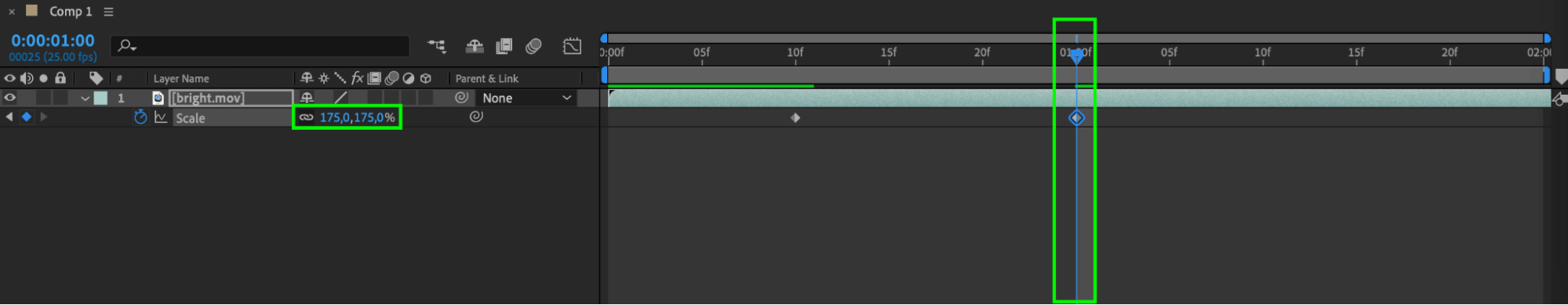 Select the layer and position the playhead where you want the zoom effect to begin. Go to the “Scale” property of the layer and set a keyframe at 100%. Move the playhead to where you want the zoom effect to end and increase the scale value to achieve the desired zoom effect. Set another keyframe at this point.