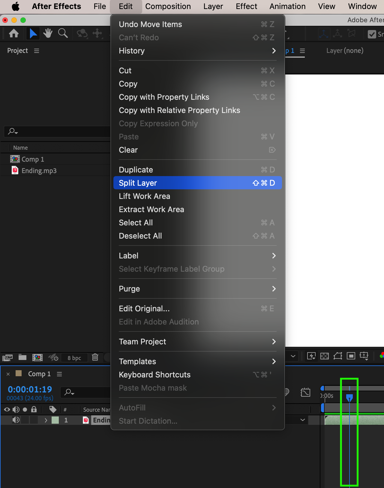 To get started, we’ll cover the essential techniques for cutting sound in After Effects. First, trimming audio clips allows you to easily remove unwanted sections by selecting the layer containing the audio clip and adjusting the duration using the hotkeys “Alt/Option + [” and “Alt/Option + ]” and the current time indicator to regulate your audio layer’s duration or using the menu Edit > Split Layer.