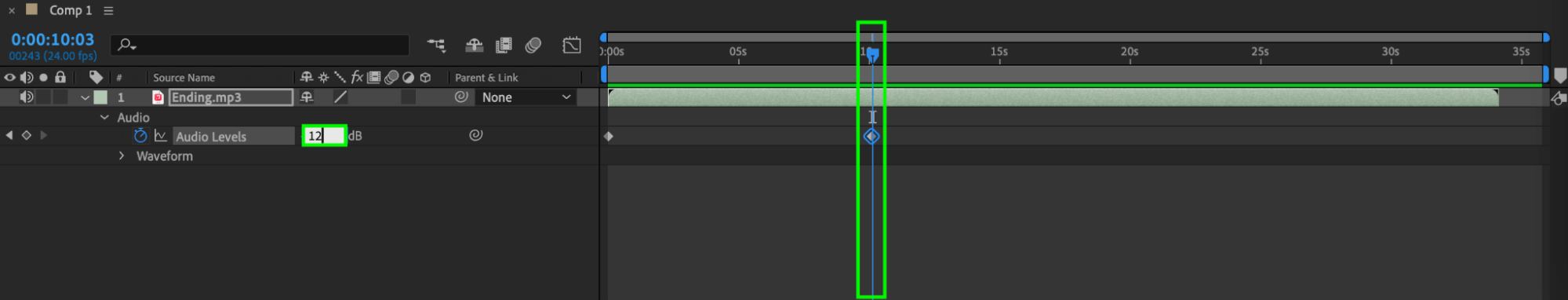 Next, keyframe editing enables you to create precise cuts or fades in and out of the sound by adding keyframes to the audio levels property. This technique is excellent for creating smooth transitions between different sections of your video. Expand your audio layer’s properties and create keyframes for the Audio Levels parameter by clicking the stopwatch icon and setting values of -70 where you want the music to stop and from 0 to 12 where you want the music to start or resume.