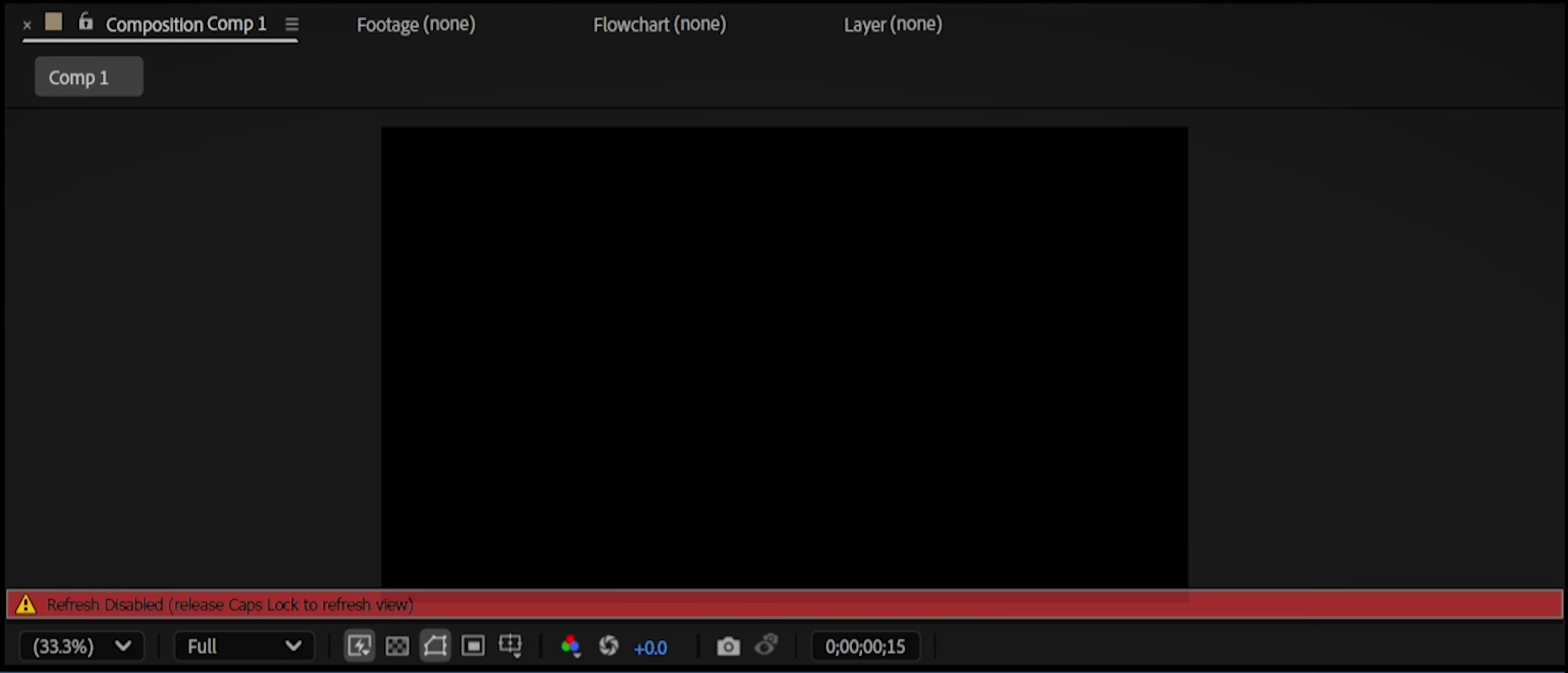 If you see the “Refresh Disabled” message, first check if the Caps Lock key is turned on. Press Caps Lock once to disable it. This issue occurs because After Effects stops refreshing the preview when Caps Lock is enabled to improve performance.