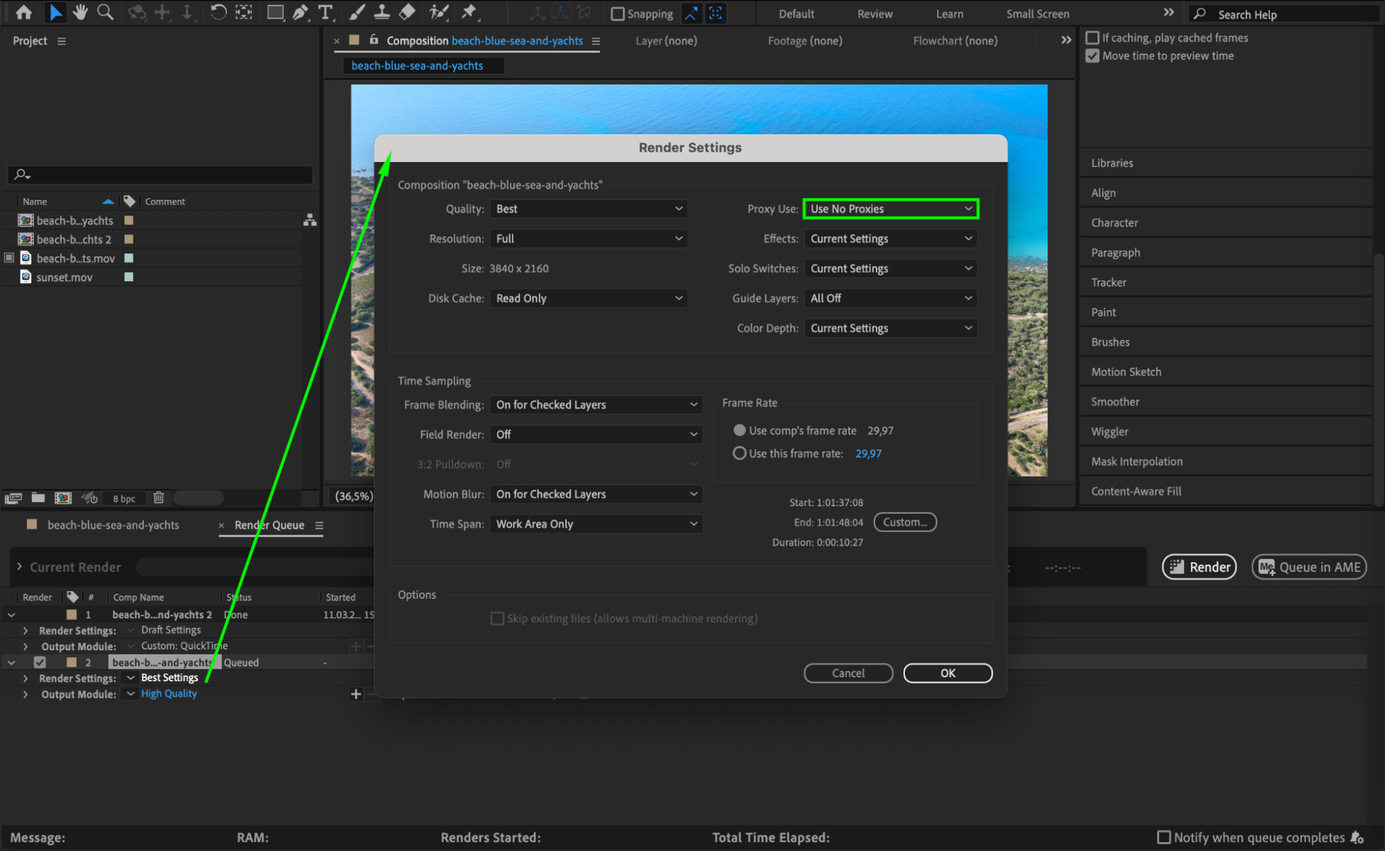 Before rendering, ensure that proxies are disabled. In the Render Queue, click on the Best Settings option, and under the Use Proxies dropdown, select Use No Proxies. This will ensure that the final output uses the original high-resolution footage.