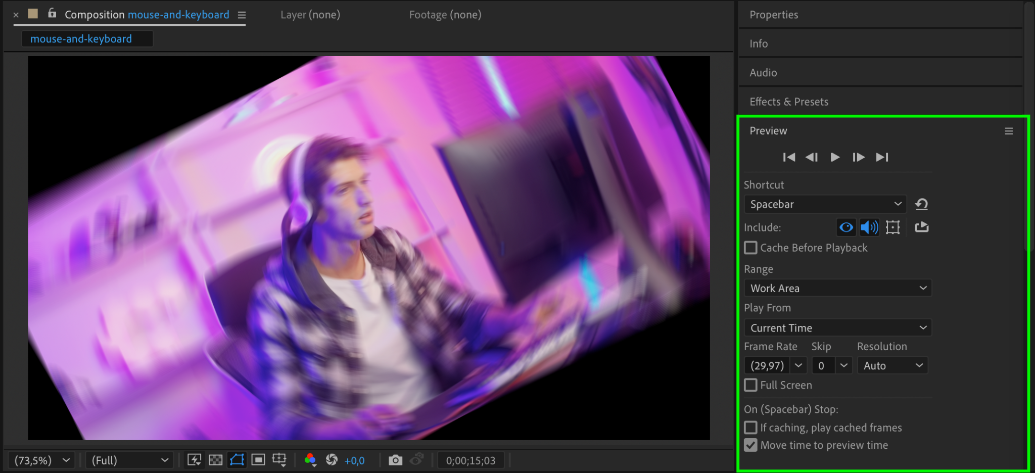Once you are satisfied with the result, render the animation by going to Composition > Add to Render Queue. Choose your settings and click Render to export the video with the spin transition effect.