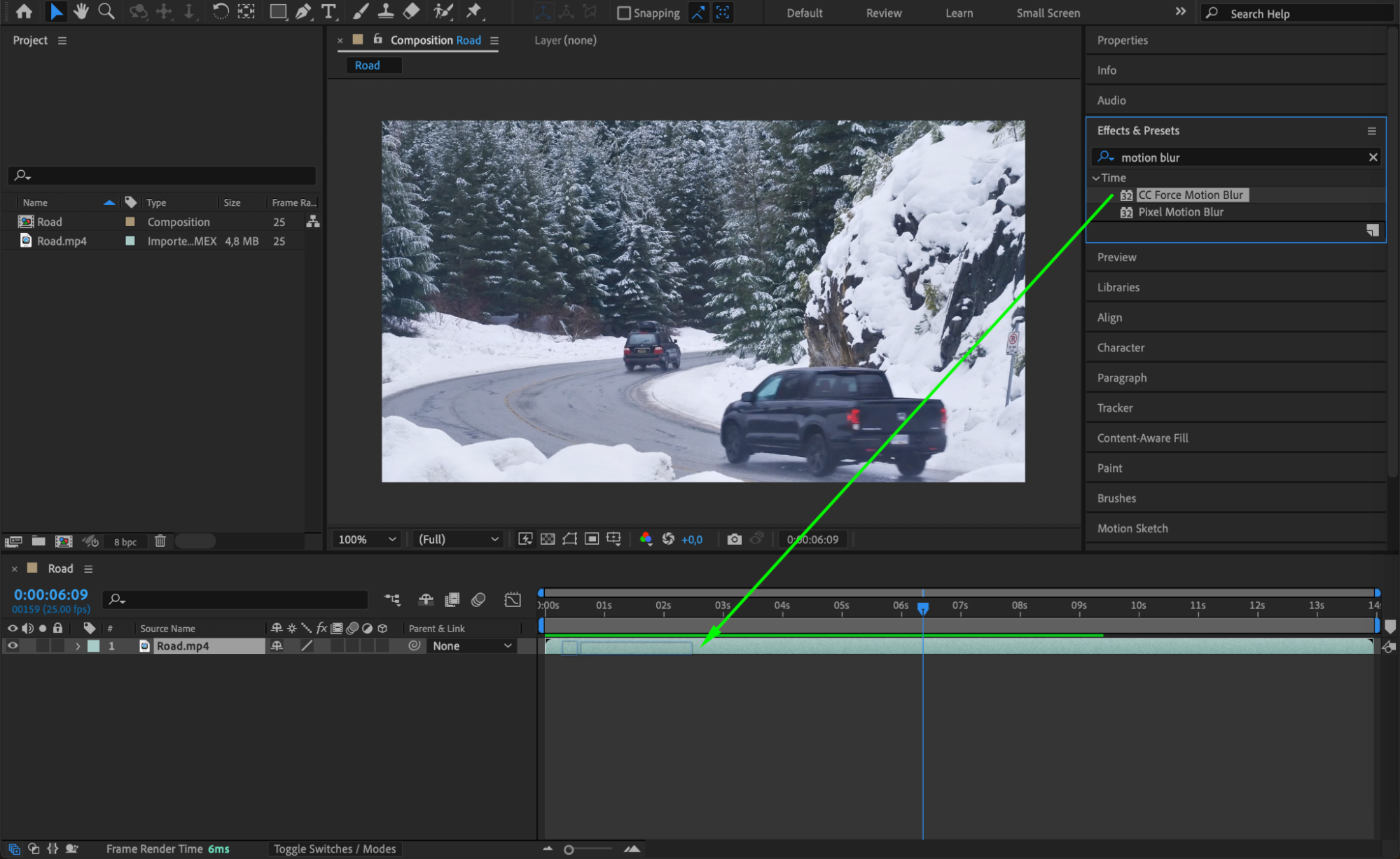 Go to the “Effects & Presets” panel, navigate to the “Time” category, and drag the “CC Force Motion Blur” effect onto your layer.