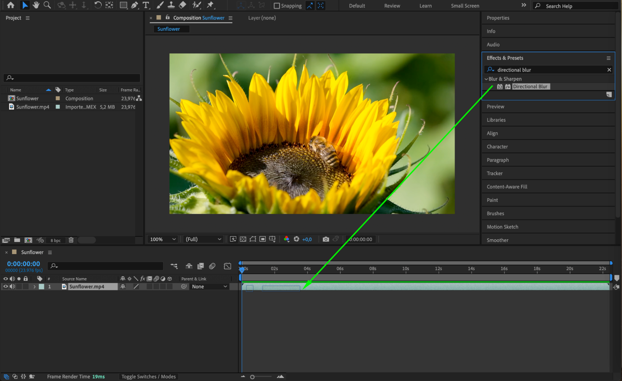 In the “Effects & Presets” panel, navigate to the “Blur & Sharpen” category, and choose the “Directional Blur” effect.