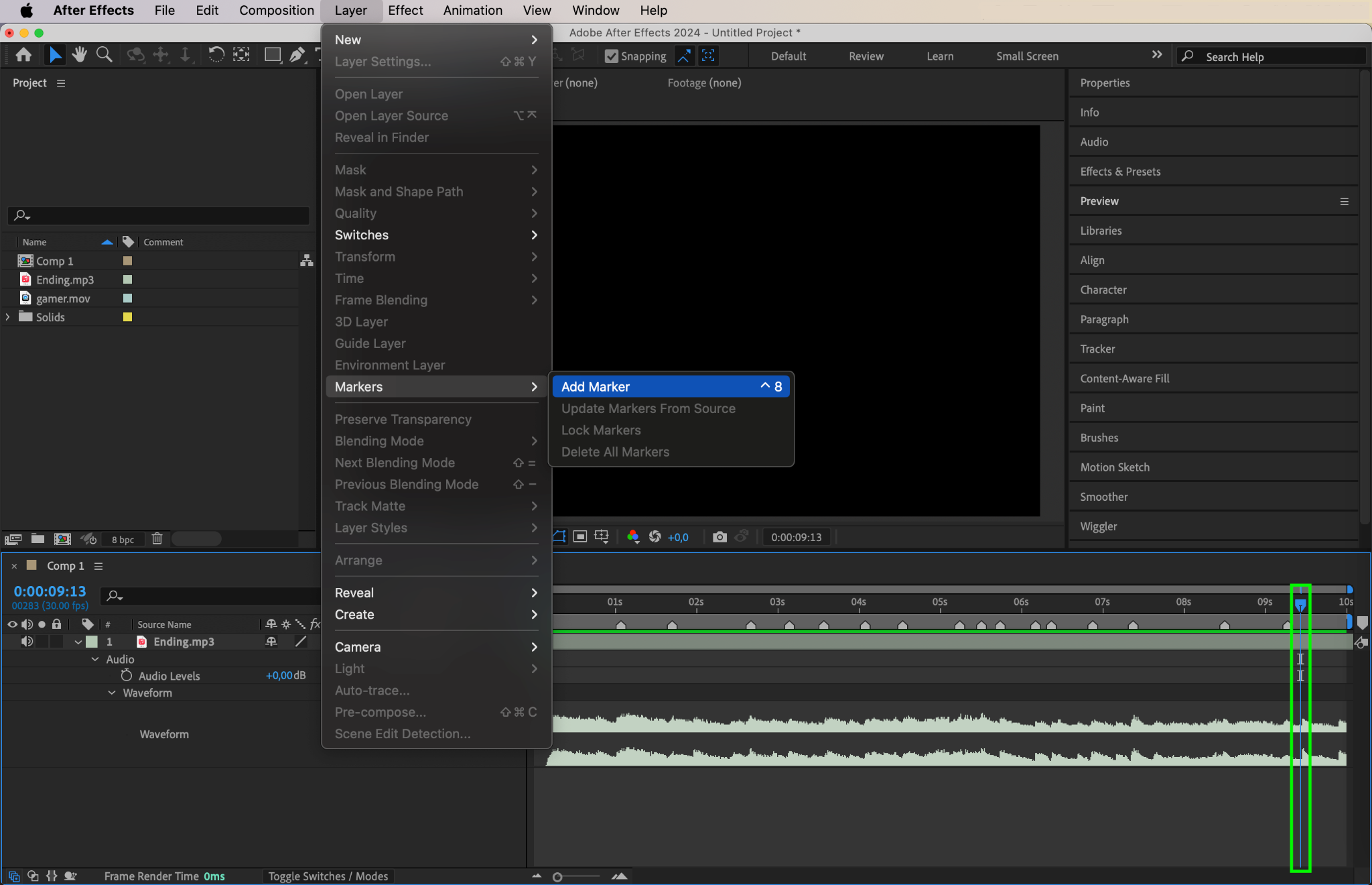 Expand the properties of your audio layer to reveal the Waveform. This will allow you to see the intensity of the beats. Based on the peaks in the waveform, add markers at the points where the beats occur. To add a marker, go to Layer > Markers > Add Marker. This will help you synchronize the video speed with the beats later on.
