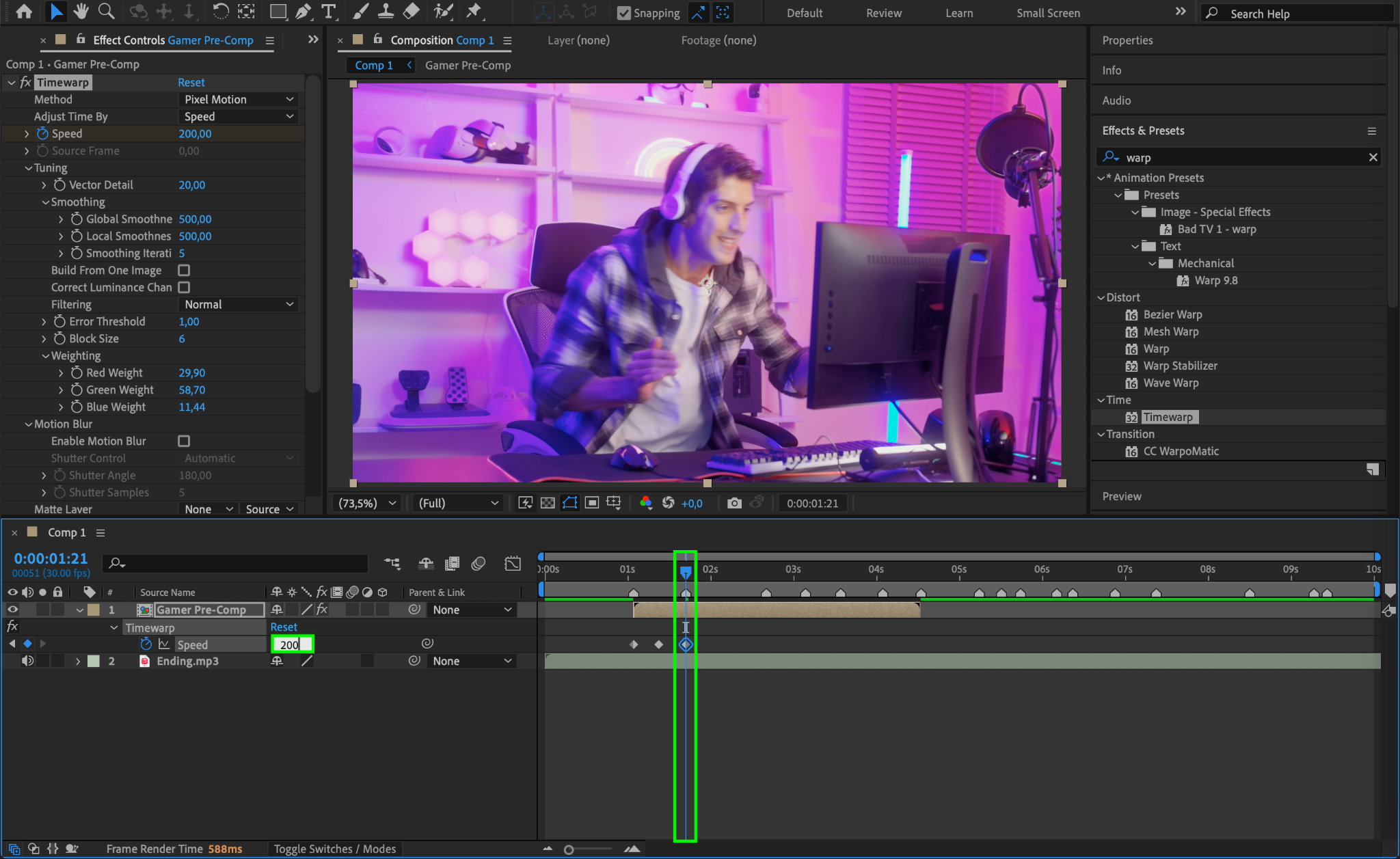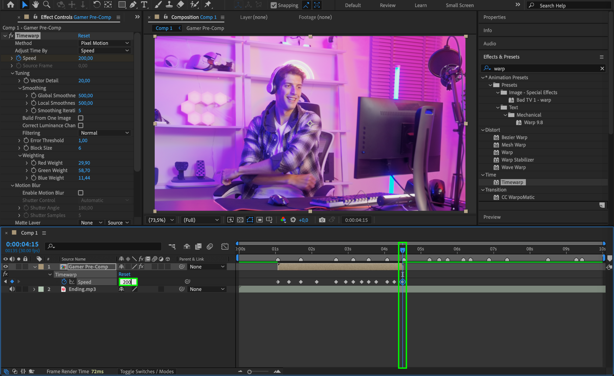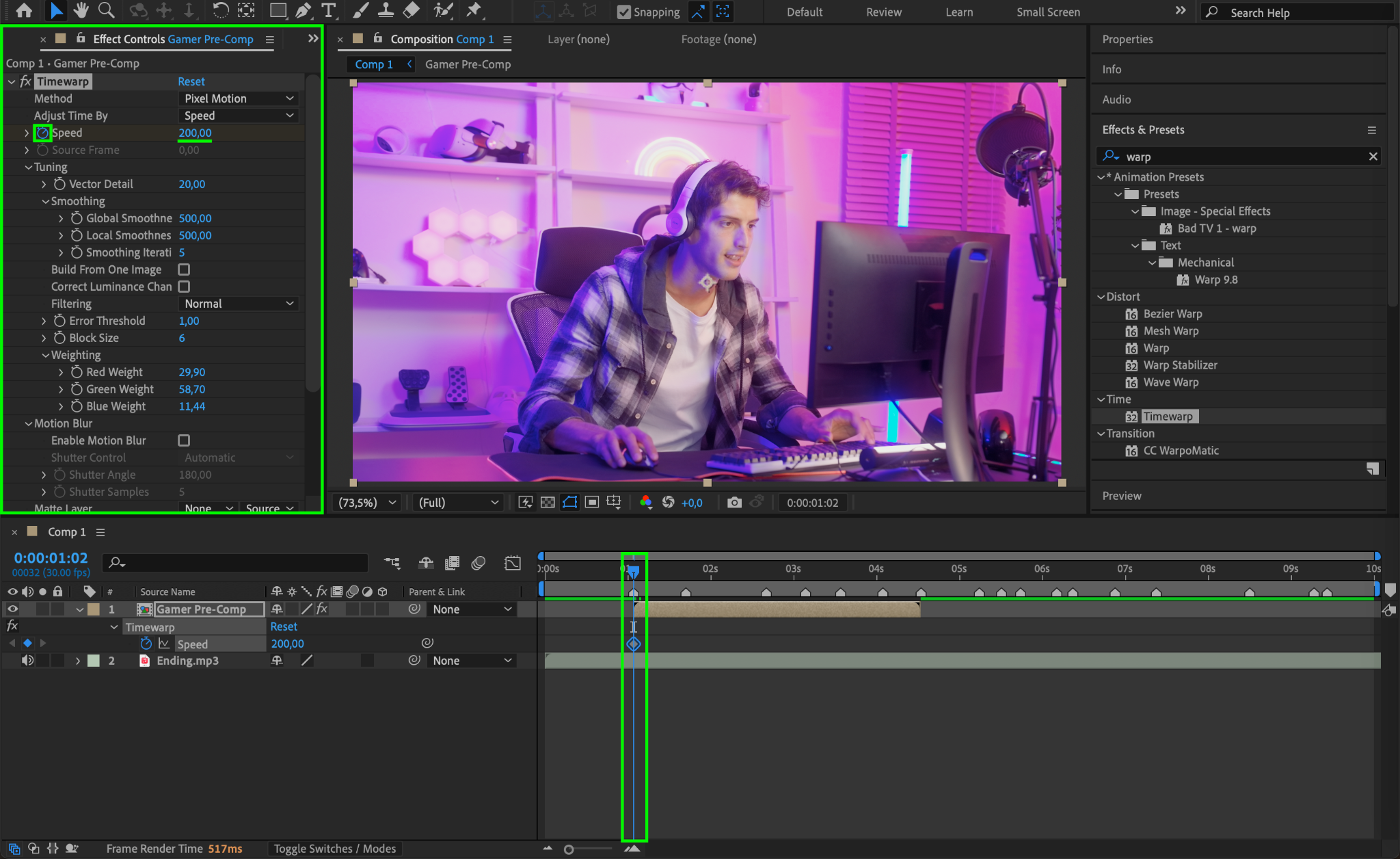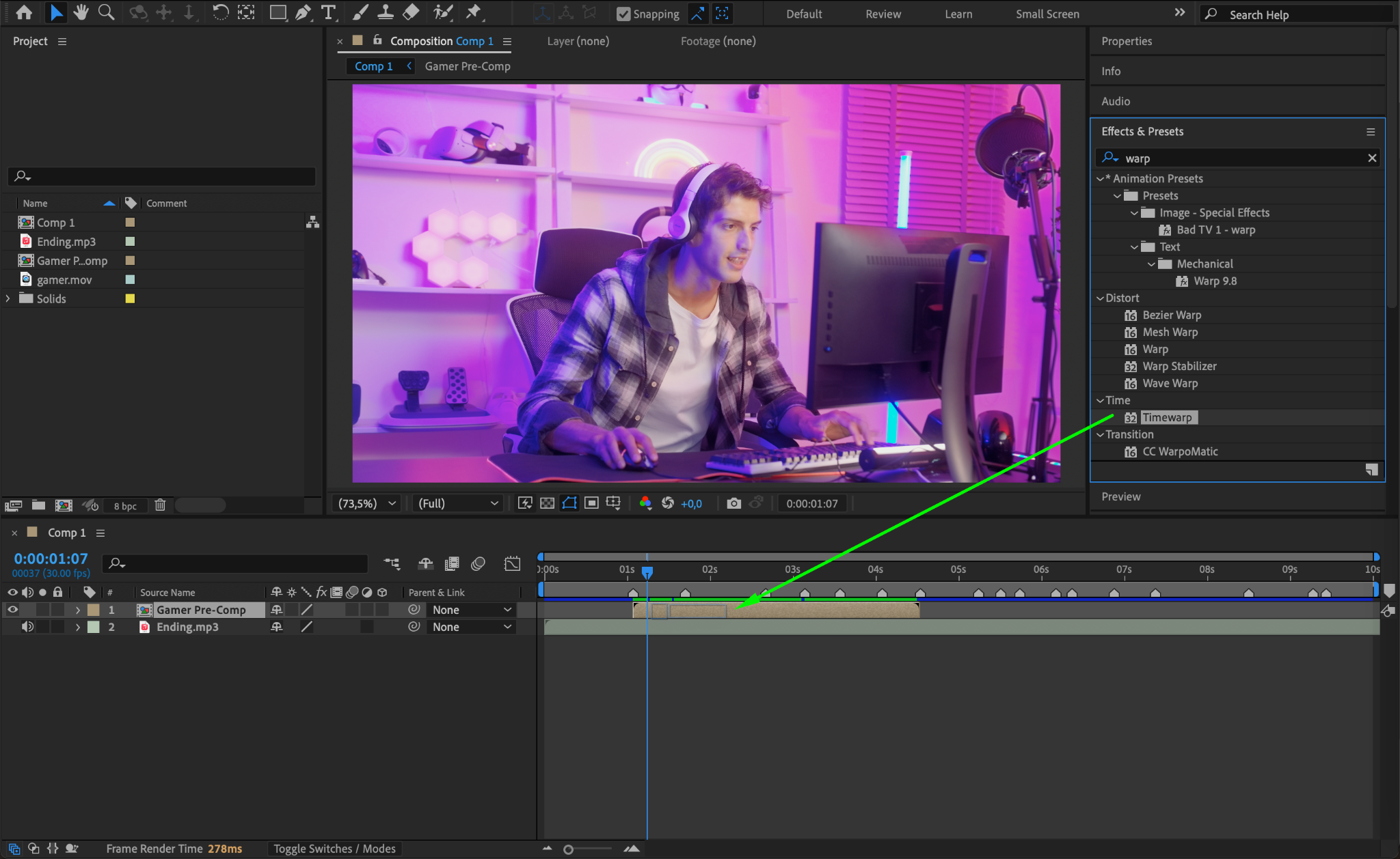 Now, apply the Timewarp effect to your pre-composed video. You can find this effect in the Effects & Presets panel. Drag and drop the effect onto your video layer.