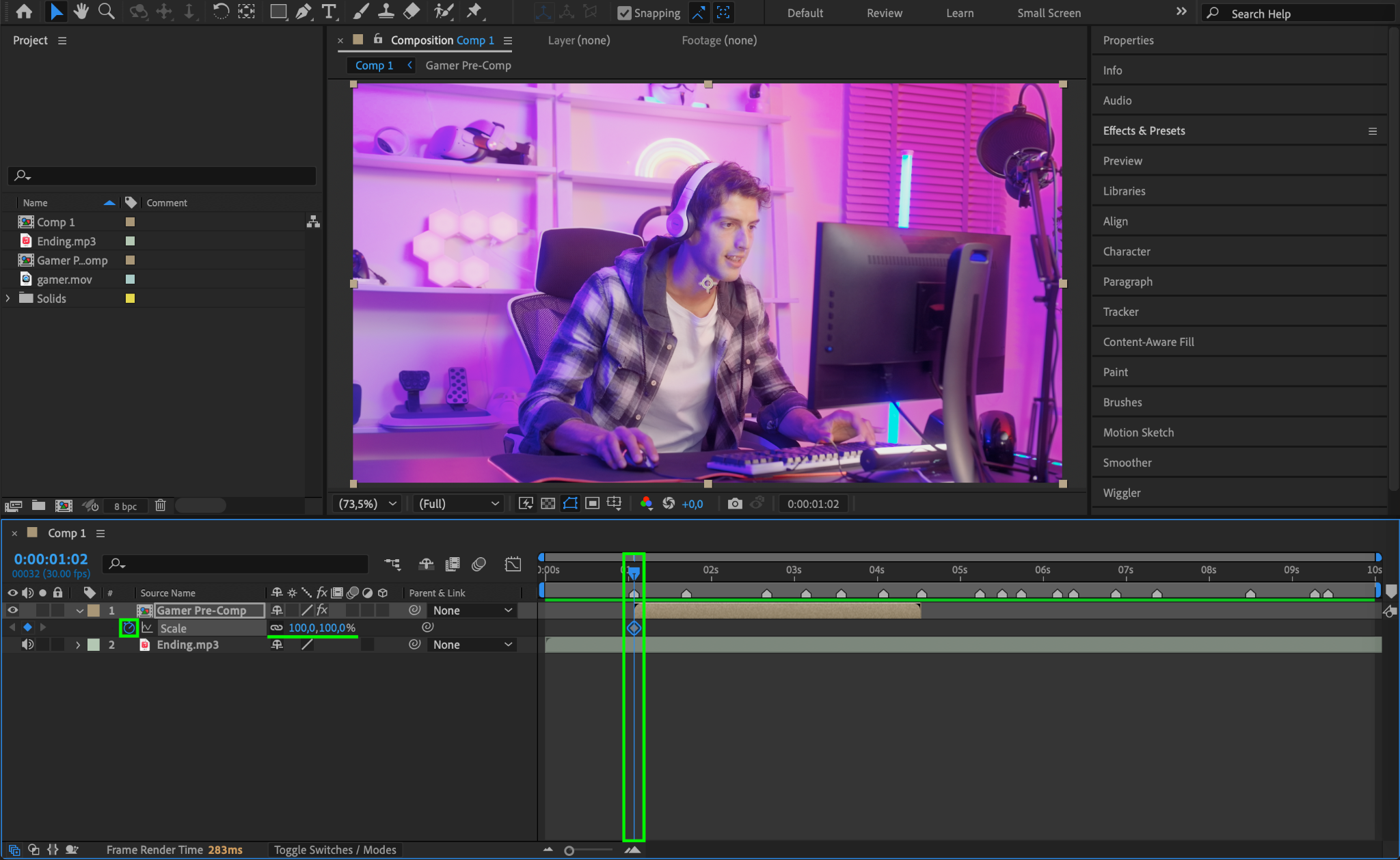To add a bit more energy to the edit, adjust the Scale of the video layer. Set the scale to 100 when the CTI is on the first marker and click the stopwatch to create a keyframe.