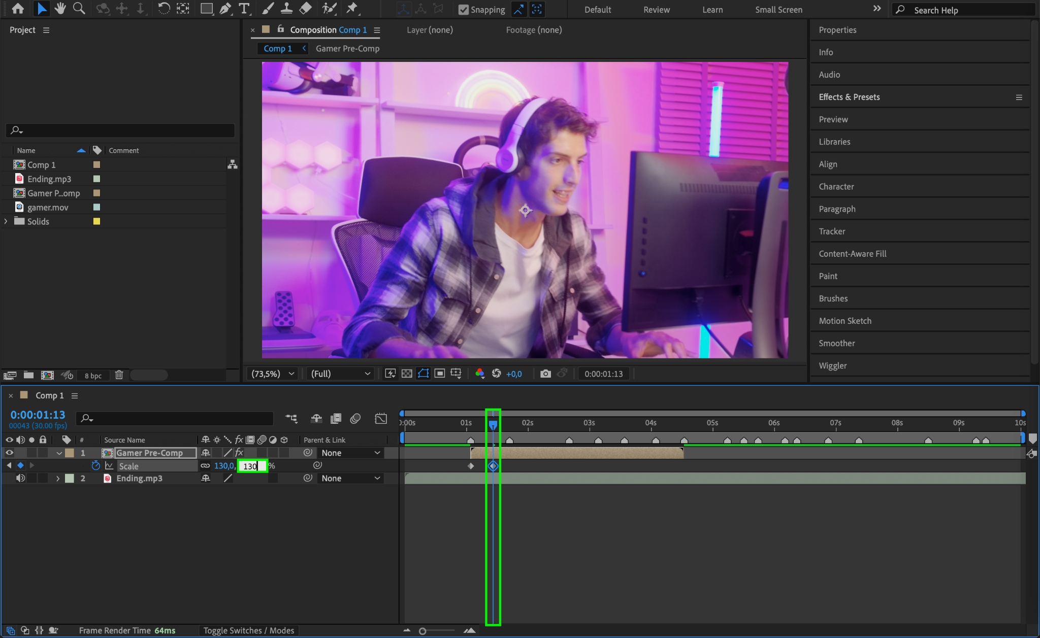 Move the CTI between the first and second markers and change the scale value to 130. This creates a zoom-in effect during the more intense sections. Then, move the CTI to the second marker and change the scale back to 100. Repeat this process as needed for each section of the video.