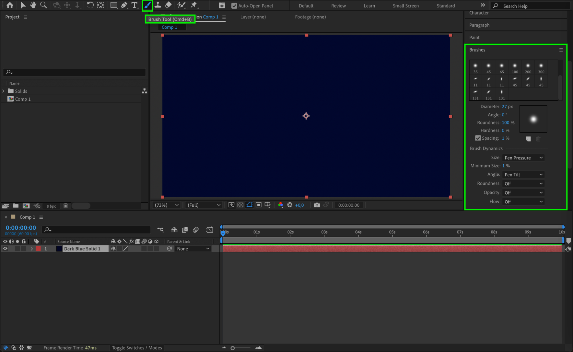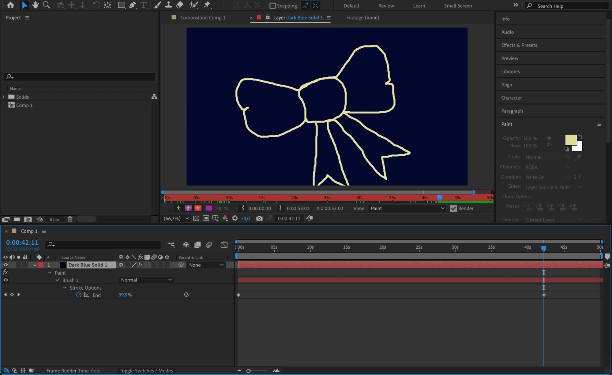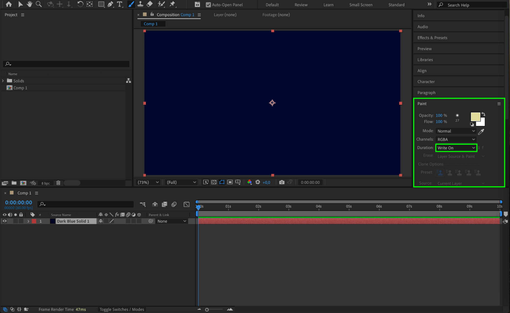 Double-click the solid layer in the Timeline Panel to open it in the Layer Panel. This view allows you to draw directly on the layer. Use the Brush Tool to draw your frame-by-frame animation. As you draw, After Effects will automatically create keyframes in the timeline, corresponding to your strokes’ timing.