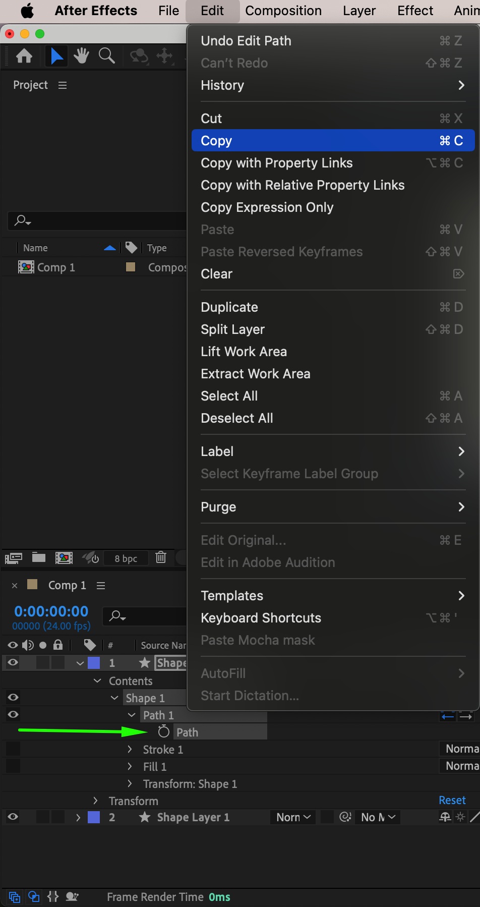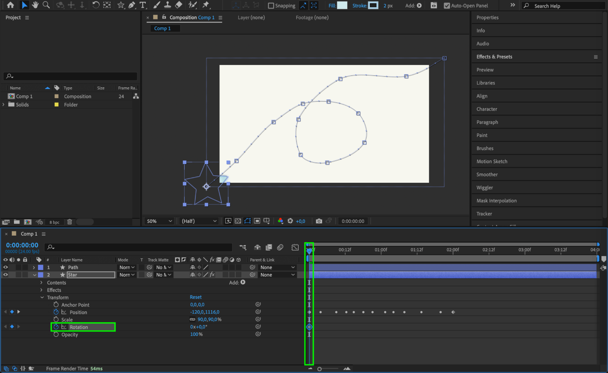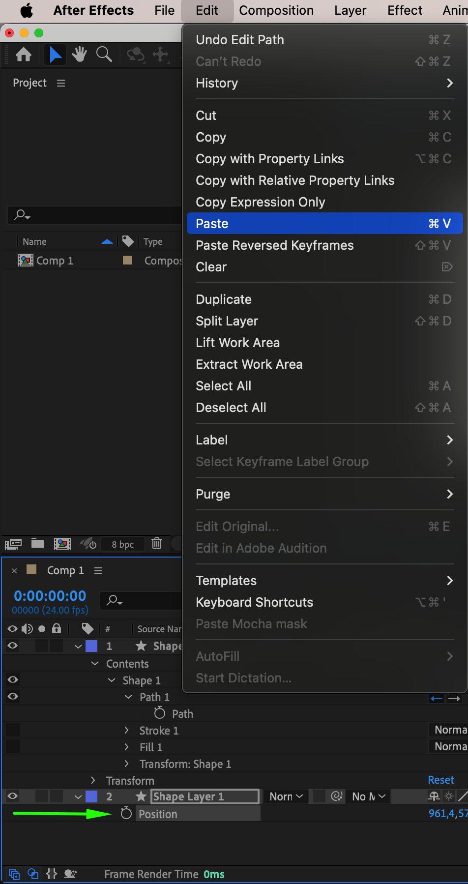 For more complex designs, use the Pen Tool (G) to draw custom paths with smooth curves and sharp angles. To apply this path to a shape layer, first copy the path value from your drawn line. Then, select the shape layer and press “P” to open the Position property. Paste the copied path value into the Position property to apply it to the shape layer. This technique allows you to seamlessly integrate custom paths into your designs.