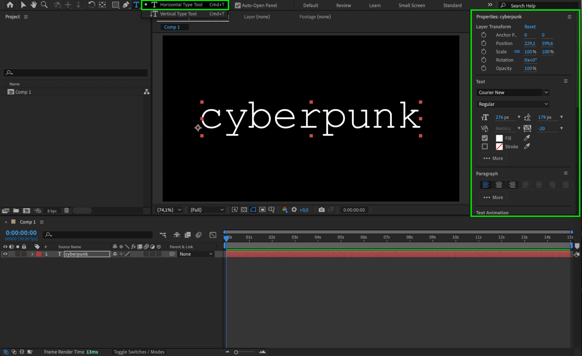 Select the Type Tool from the toolbar or press “Ctrl/Cmd + T”. Click anywhere in the composition and type your desired text. Adjust the font, size, and color in the Character Panel or Properties Panel to suit your style. Center the text by enabling the Align Panel and aligning it horizontally and vertically.