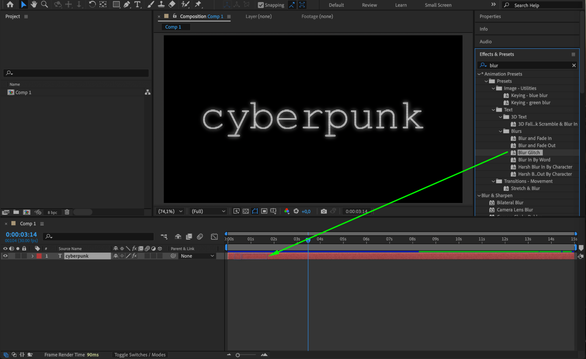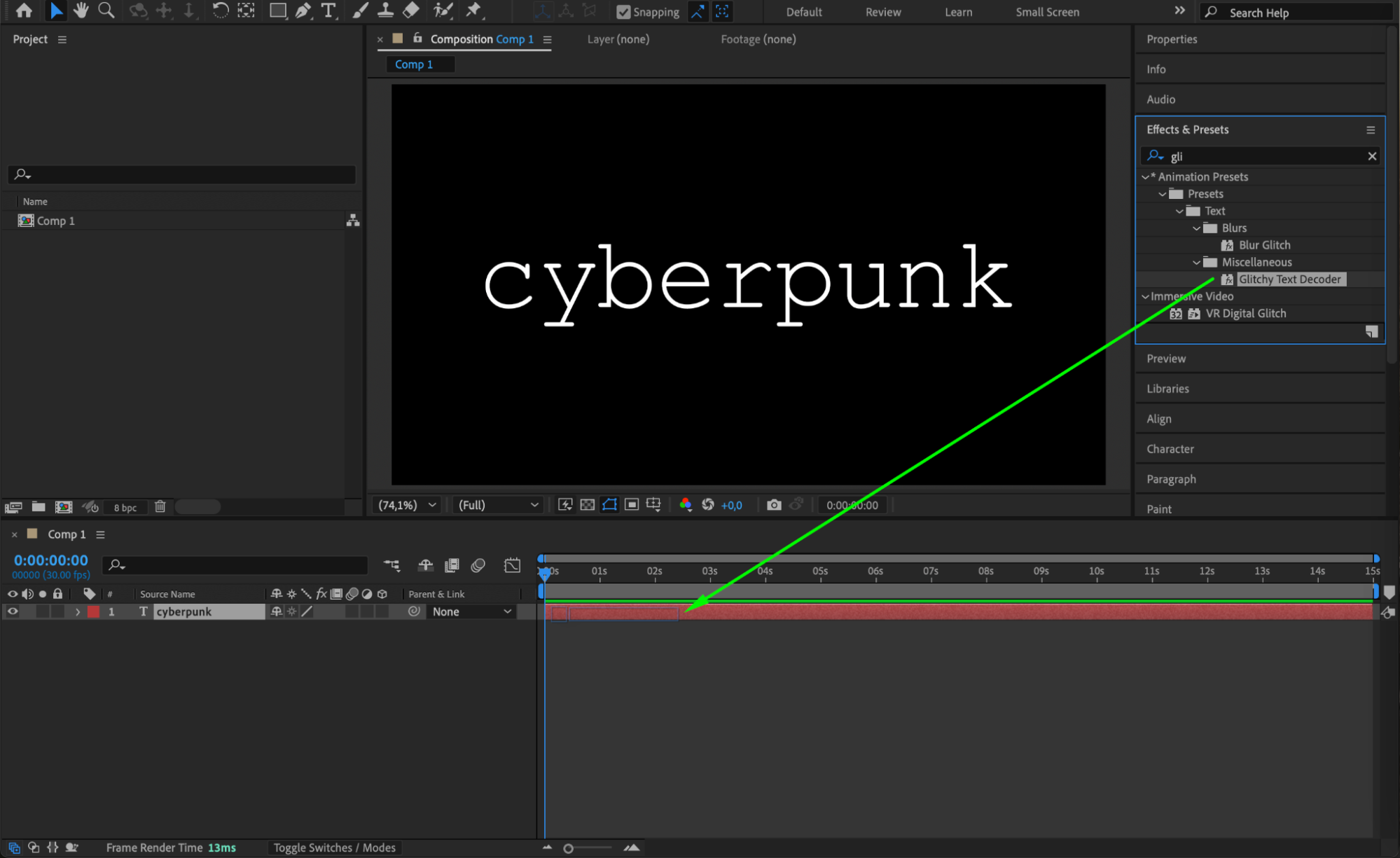 In the Effects & Presets Panel, search for the Glitchy Text Decoder effect. Drag and drop it onto the text layer. Adjust its parameters in the Effect Controls Panel to customize the glitch intensity and timing. Next, search for the Blur Glitch effect and apply it to the text. Fine-tune the settings to achieve the desired level of distortion and motion blur.