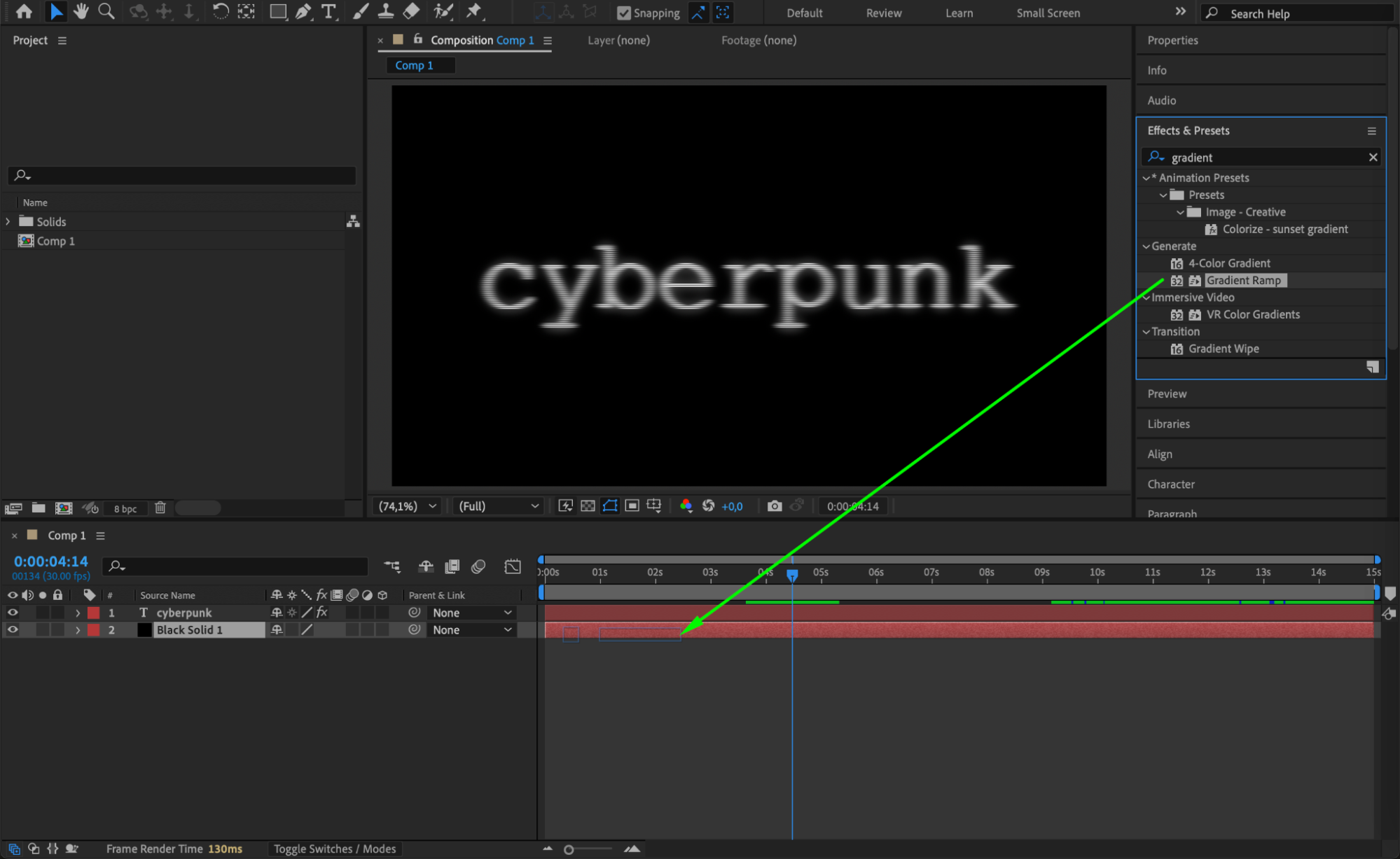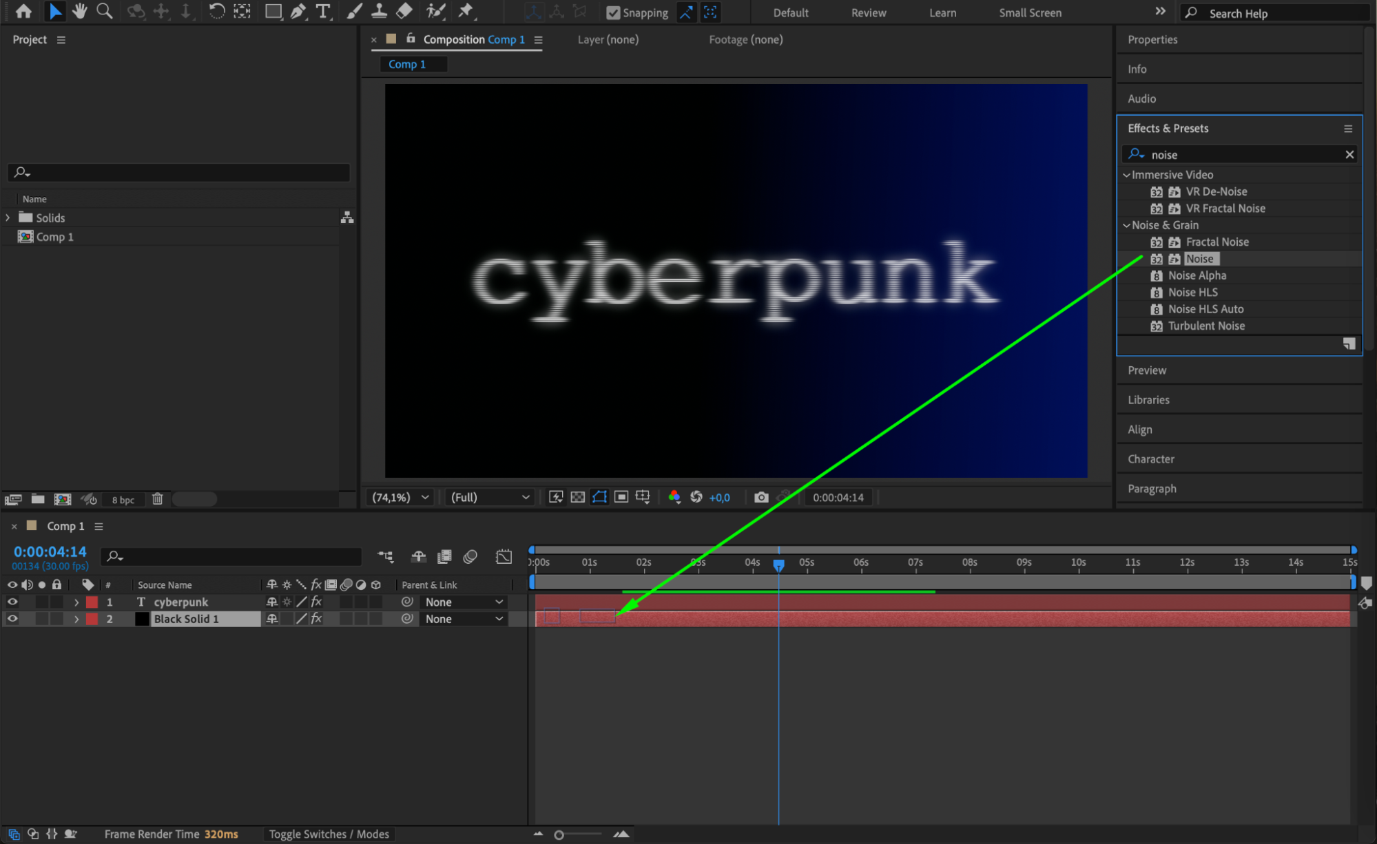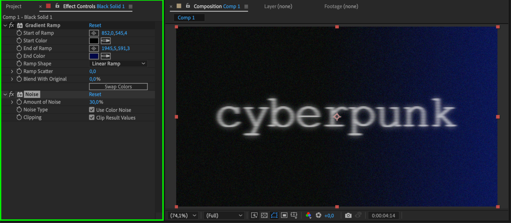 With the black solid layer selected, go to the Effects & Presets Panel and search for Gradient Ramp. Apply it to the solid layer and set the Start Color to dark green and the End Color to dark blue for a cyberpunk aesthetic. Then, search for the Noise effect and apply it to the same layer. Set the Amount of Noise to 30% to add texture and grit to the background.