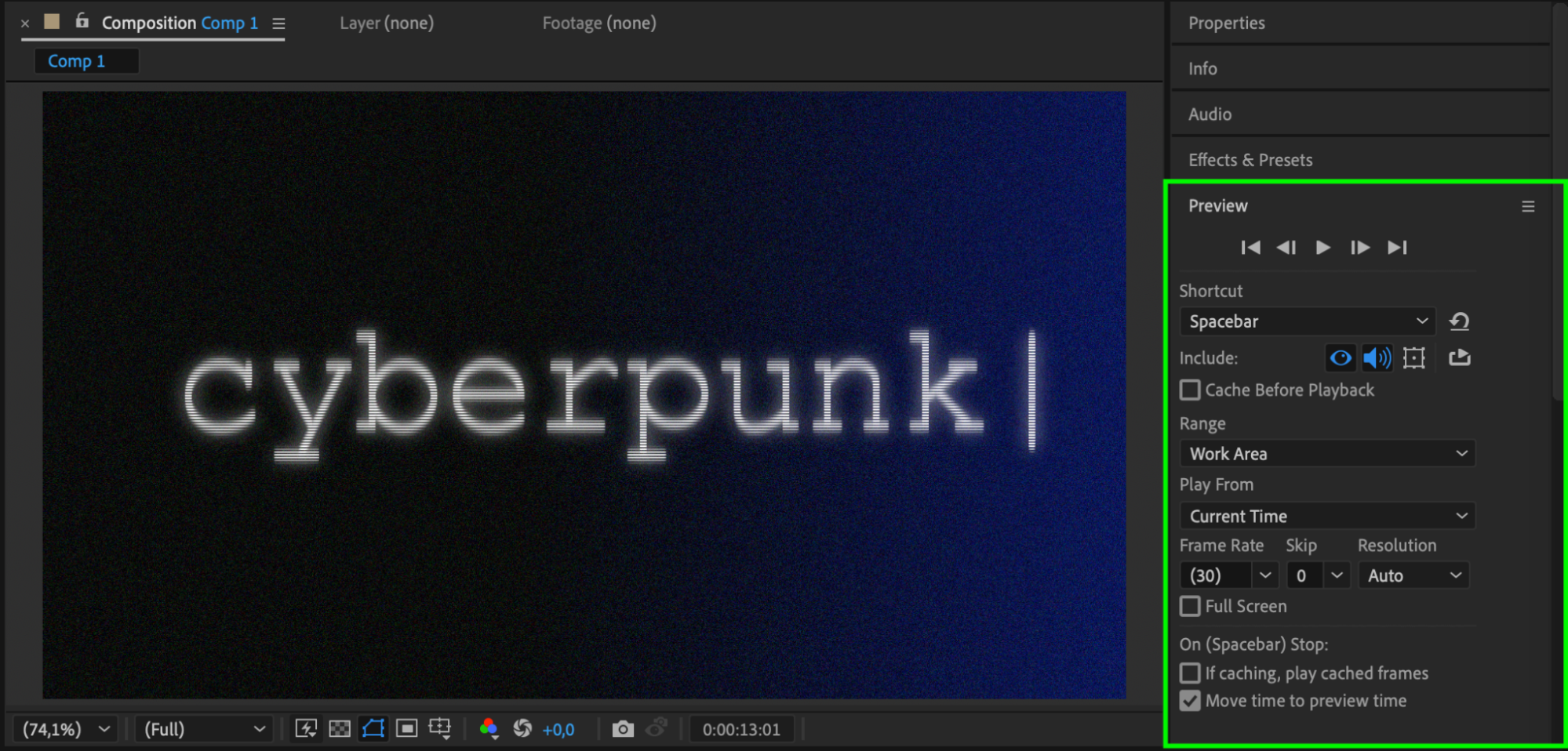 Once you’re satisfied with the result, render your project. Go to Composition > Add to Render Queue, configure your output settings, and click Render. This exports your glitch text animation, ready for use in any project.