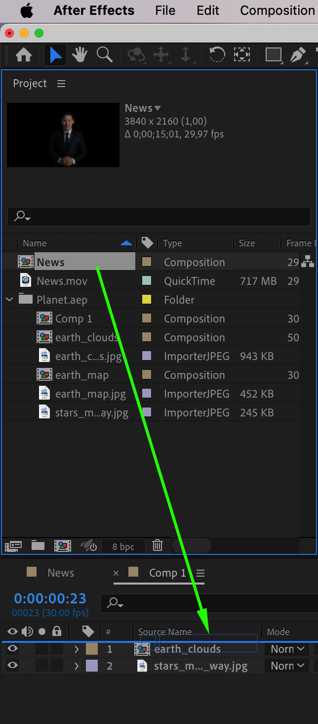 Next, open the composition or project where you want to place the keyed footage. Once the new composition is open, drag and drop the composition containing your keyed footage onto the timeline panel. This step integrates your subject into the new environment, making it ready for further adjustments and enhancements.