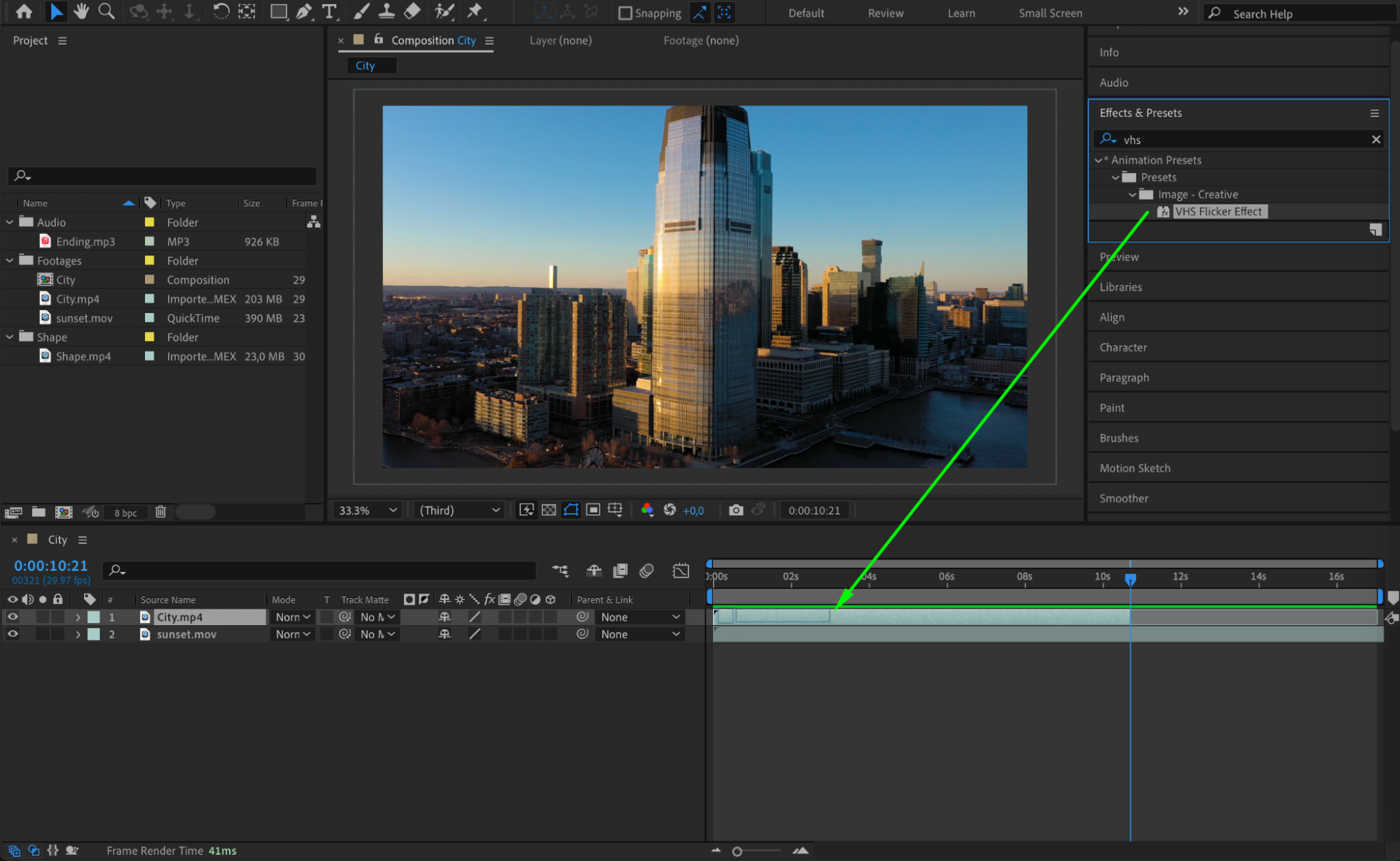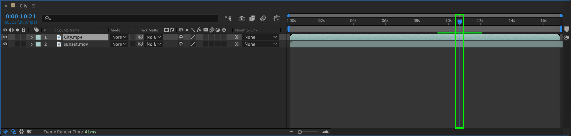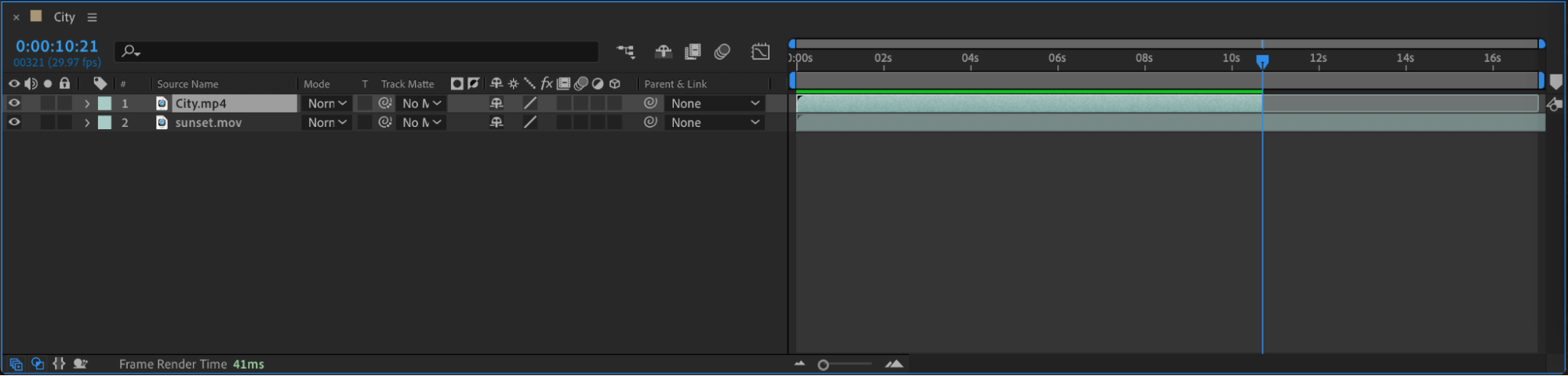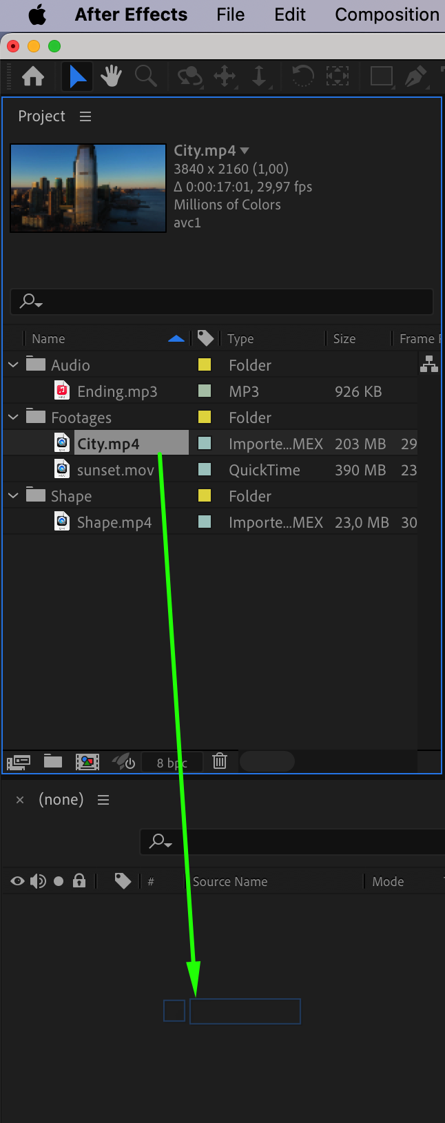 Once you have your files in the project panel, drag them onto the timeline. Doing so will automatically create a composition that matches the settings of your video. From here, you can start editing right away.