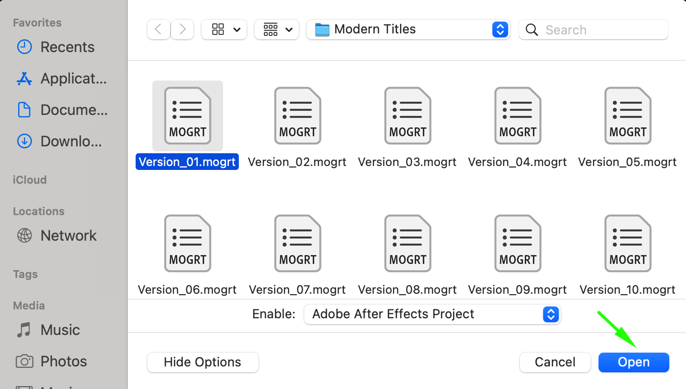 Launch After Effects and open the .mogrt file by going to File > Open Project or using the shortcut “Ctrl/Cmd + O”. Navigate to the location of the .mogrt file on your computer and select it. Click Open. A dialog box will appear asking for the file’s name and save location. Click Extract to import the project.