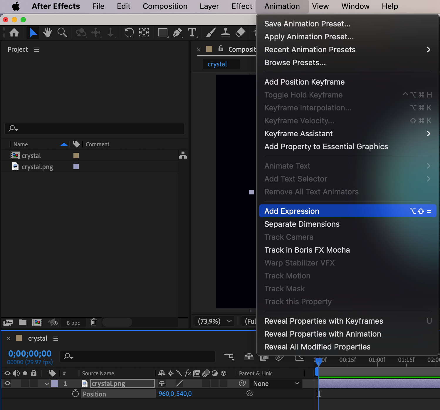Start by opening your project in After Effects. Make sure the layer or property you want to apply the expression to is selected. You can apply expressions to almost any property in After Effects, such as position, scale, opacity, rotation, and more.