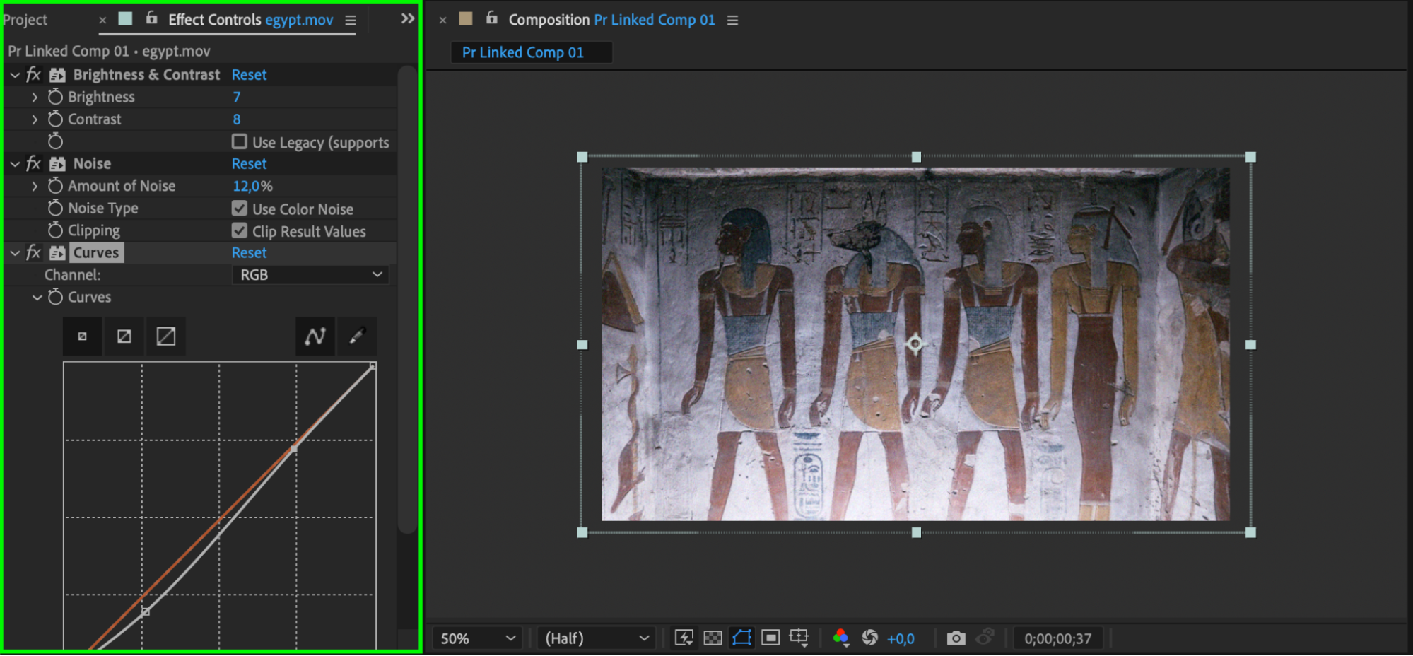 Now that the clip is linked to After Effects, you can add effects, text, animations, or any other enhancements. For example, add visual effects like color grading, motion graphics, or special transitions to make the clip more dynamic. Since this composition is linked, any adjustments you make will update automatically in Premiere Pro.