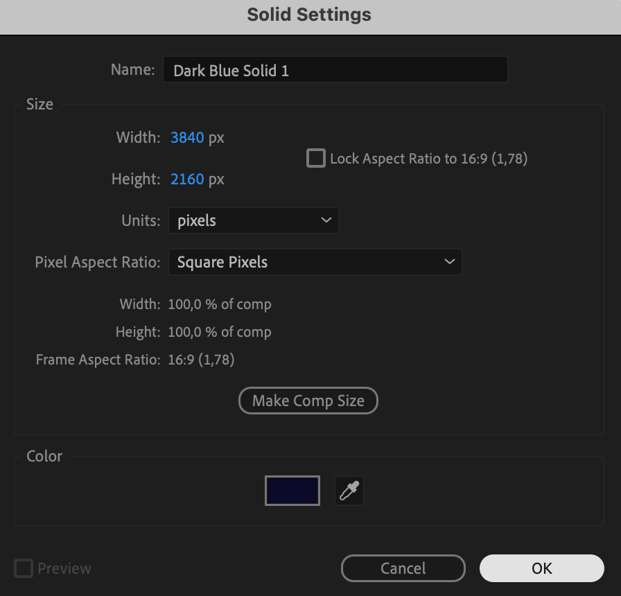 Next, go to Layer > New > Solid and choose a color for your background. This solid layer will serve as the background for your video’s ending. You can pick any color that complements your video or choose a darker tone to transition into the end.