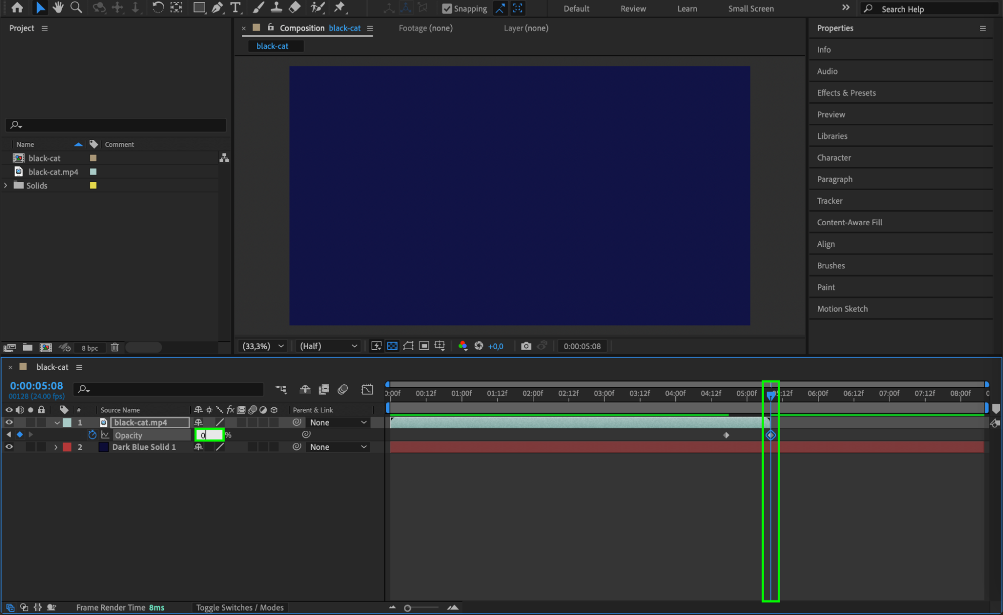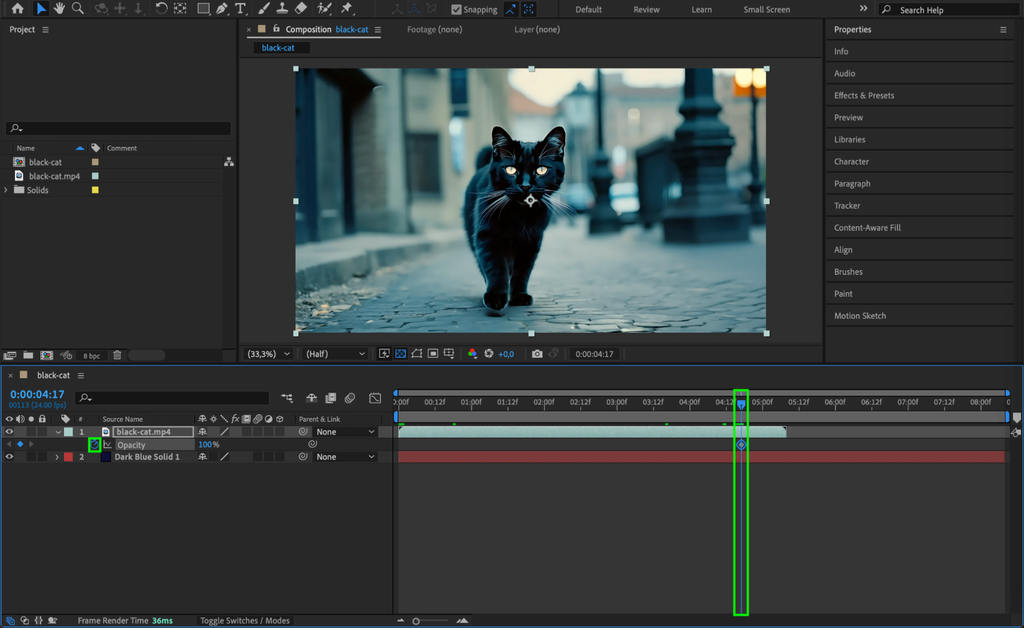 Position the solid layer beneath your video layer in the timeline. Now, animate the opacity of the video layer. Set the opacity to 100% at the point where you want the video to end, and keyframe it to 0% a few frames later. This will create a smooth fade-out effect.