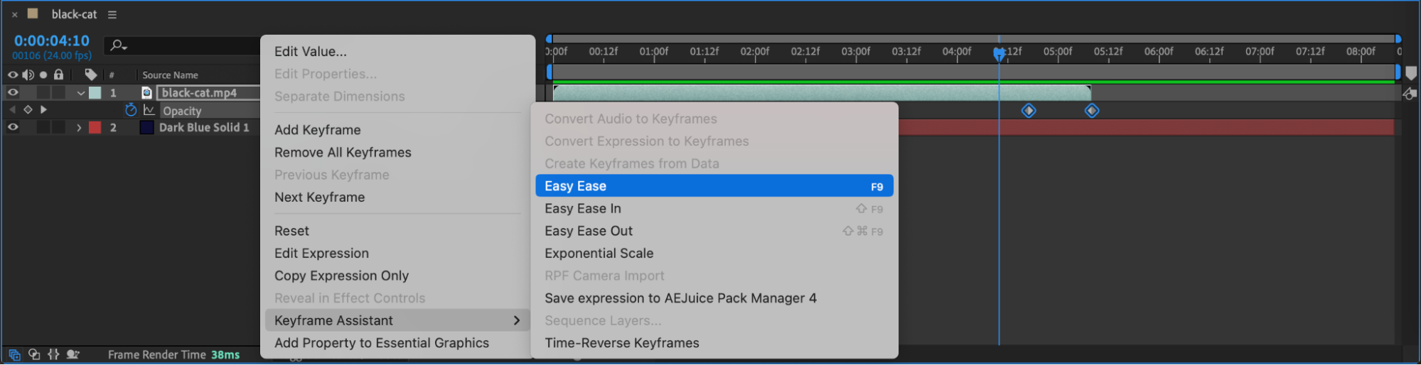 To smooth out the transition, select the keyframes you created and right-click on them. Choose Keyframe Assistant > Easy Ease. This will create a more fluid fade-out effect, making the transition look natural.