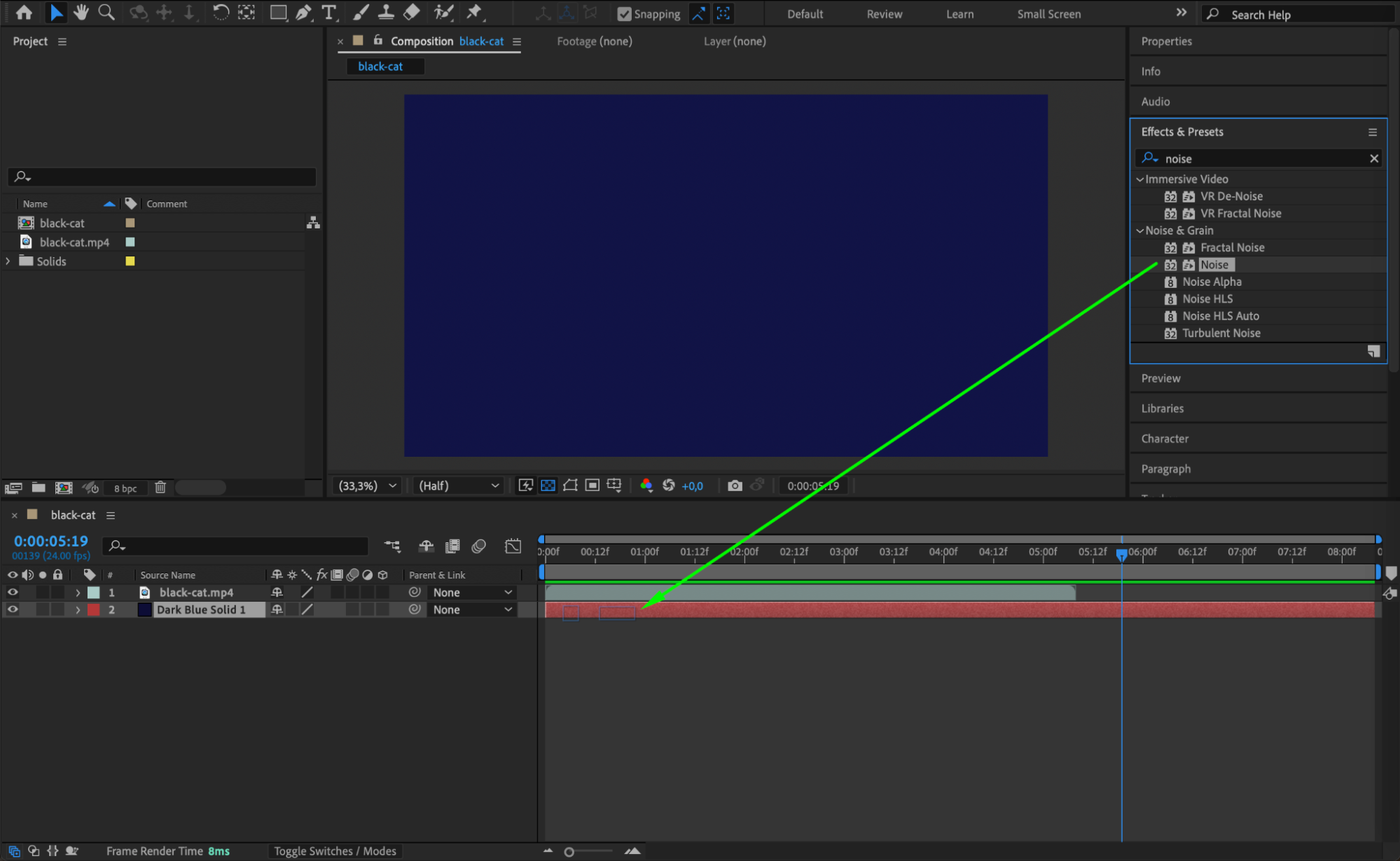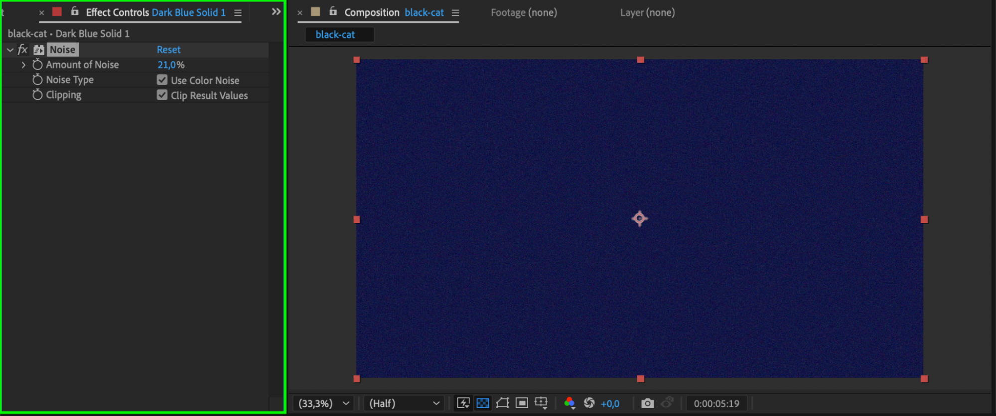 To give some texture to your solid background, apply a Noise effect. Go to Effect > Noise & Grain > Noise and adjust the settings to your liking. This effect will add a bit of grain or texture, giving the background a more cinematic look.