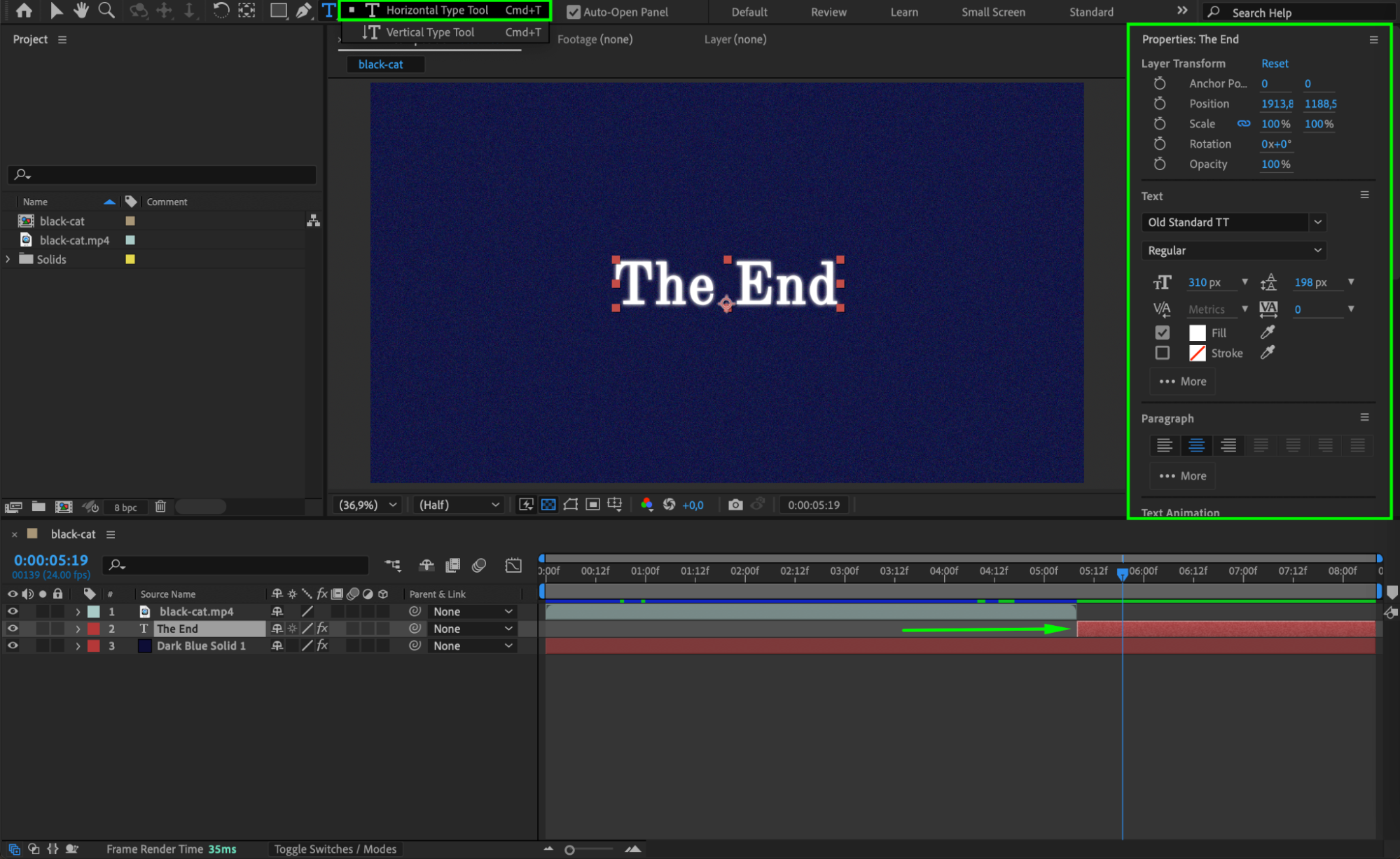 Now, use the Text Tool (Ctrl/Cmd + T) to add any text you’d like to appear at the end of your video. This could be a call-to-action, credits, or a simple message. Set the duration of the text layer so that it appears for the desired length of time before the video ends.