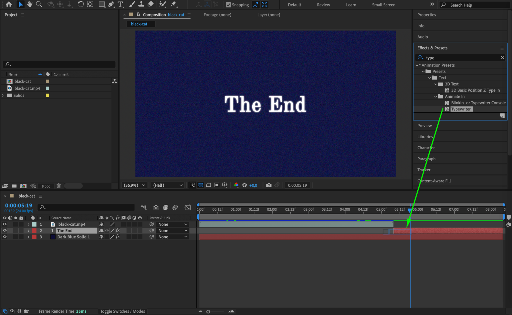 For a professional touch, use a Typewriter preset to animate the text, or create your own custom animation. You can find the Typewriter preset in the Effects & Presets panel. Apply it to your text and adjust the timing to fit your video’s style.