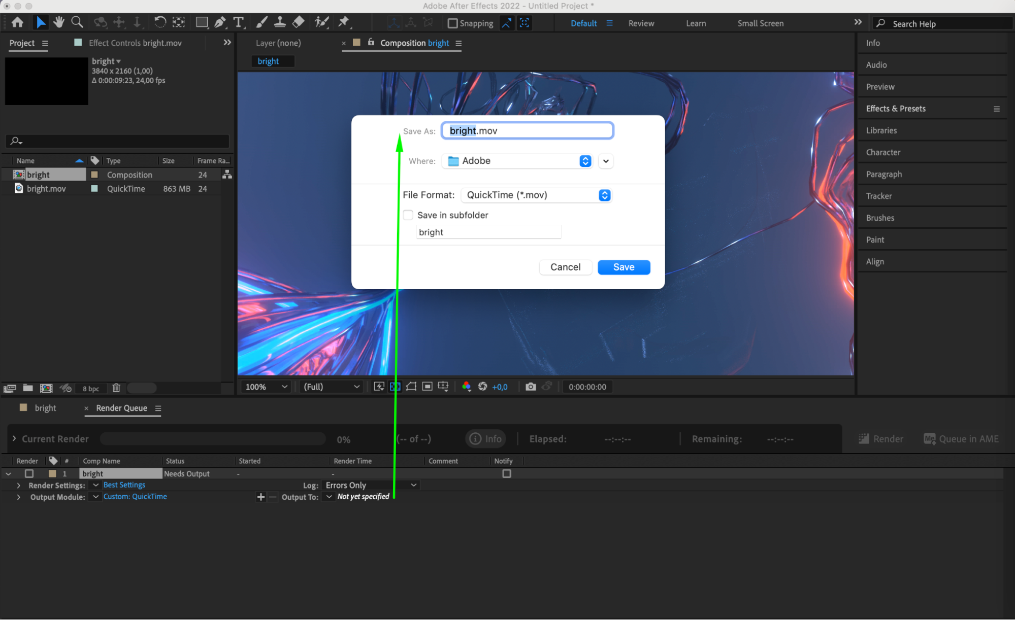 After you’ve finished configuring the export settings for your project, click on the “Output To” button and select the location for saving the file, as well as specify a name for the saved file. Then, click the “Render” button to initiate the export process for your project.