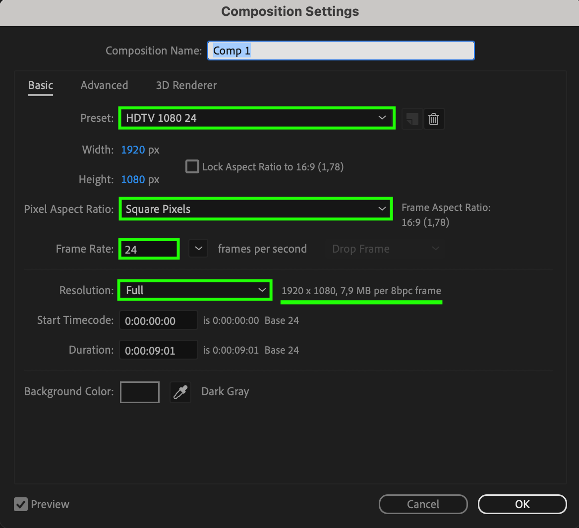 Before exporting, verify that composition settings are properly configured, including aspects such as preset, pixel aspect ratio, resolution, and frame rate.