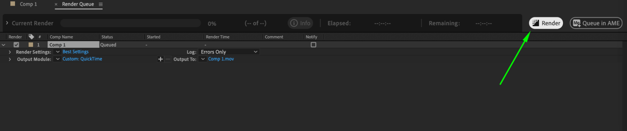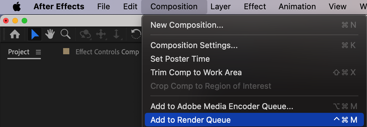 Navigate to the render queue panel by selecting “Composition” > “Add to Render Queue.”