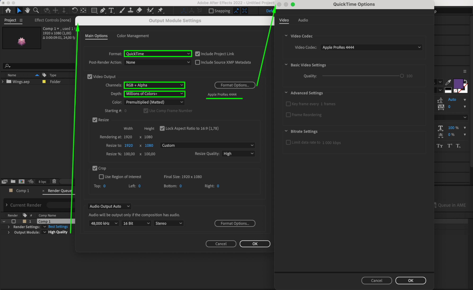 Within the render queue panel, navigate to “Output Module Settings” and adjust parameters such as format, channels, depth, and video codec. For high-quality projects requiring transparency preservation and maximum color detail, it is recommended to choose the QuickTime format with the ProRes 4444 codec and alpha channel. This format ensures high image quality and transparency support, making it ideal for animations, compositions with transparent elements, or scenes with graphical effects. By using this format, you preserve all the details and quality of your project, ready for use on various platforms and in different applications.