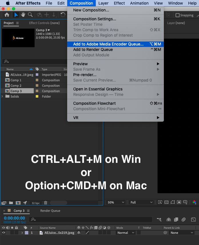 1. Open your composition in After Effects and select Composition > Add to Media Encoder Queue… This will start Media Encoder if it is not already open on your machine. You can also use the keyboard shortcut CTRL+ALT+M on Win or Option+CMD+M on Mac.