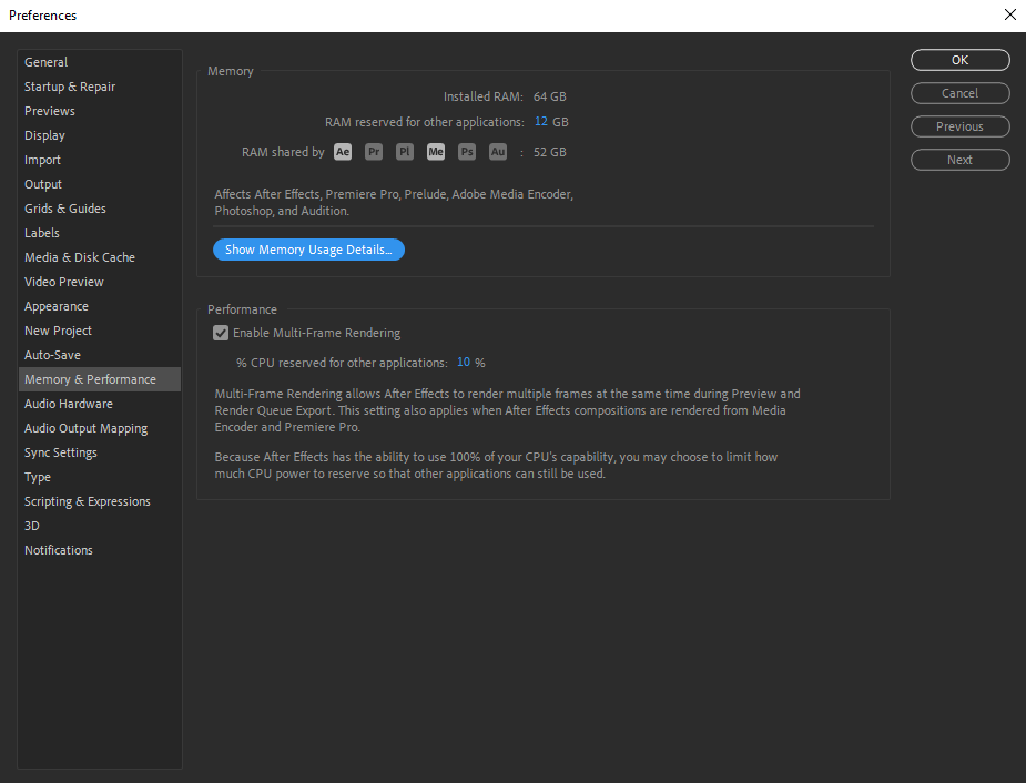 If your computer has a multi-core processor, take advantage of the multiprocessing option in After Effects to speed up the export process. To enable it, go to “Edit” > “Preferences” > “Memory & Performance” (Ctrl+Alt+; / Command+Option+;) and check the box for “Enable Multi-Frame Rendering”.