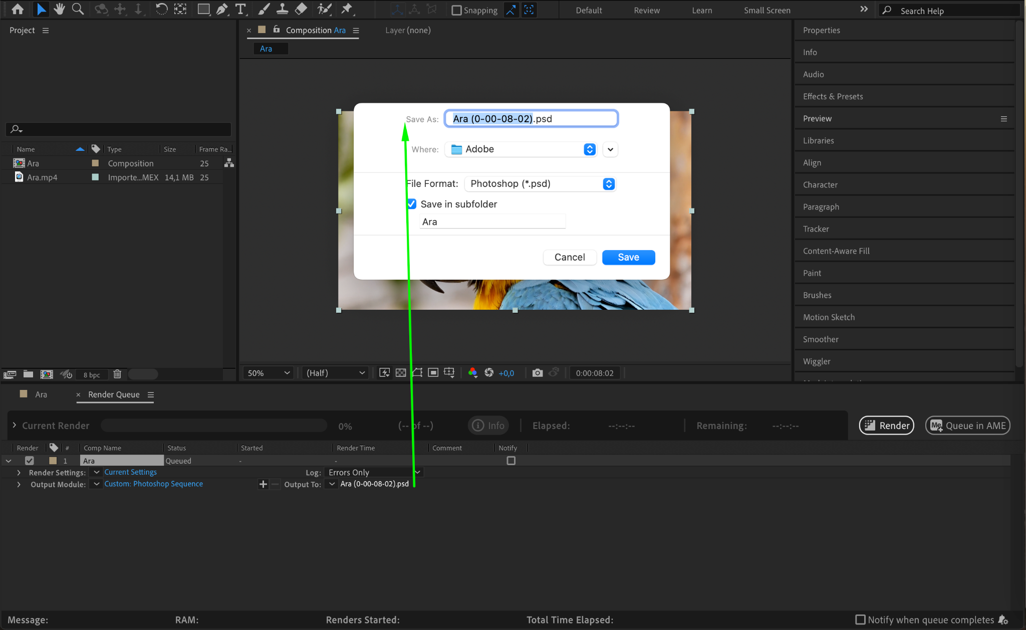 To start the export process, navigate to the Composition menu and select Save Frame As > File or use the shortcut “Ctrl/Cmd + Alt/Option + S”. This will open a dialog box where you can choose the output location and format. Opt for an image format like Photoshop Sequence or JPEG, which is suitable for high-quality images.