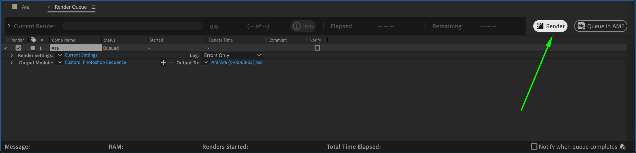 The Render Queue panel will appear. Click on the format option next to the Output Module section. Customize the settings according to your requirements, such as choosing the quality format, color depth, and whether to enable an alpha channel. Review and adjust these settings before proceeding.