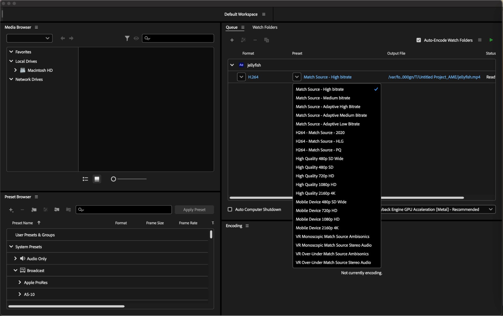 When selecting H264 as the format, you can further refine your settings by choosing a preset. Presets are pre-configured settings designed to optimize video output for specific purposes, such as web publishing, broadcasting, or high-quality playback. Common presets include “YouTube 1080p HD,” “Match Source – High Bitrate,” and “Custom.”