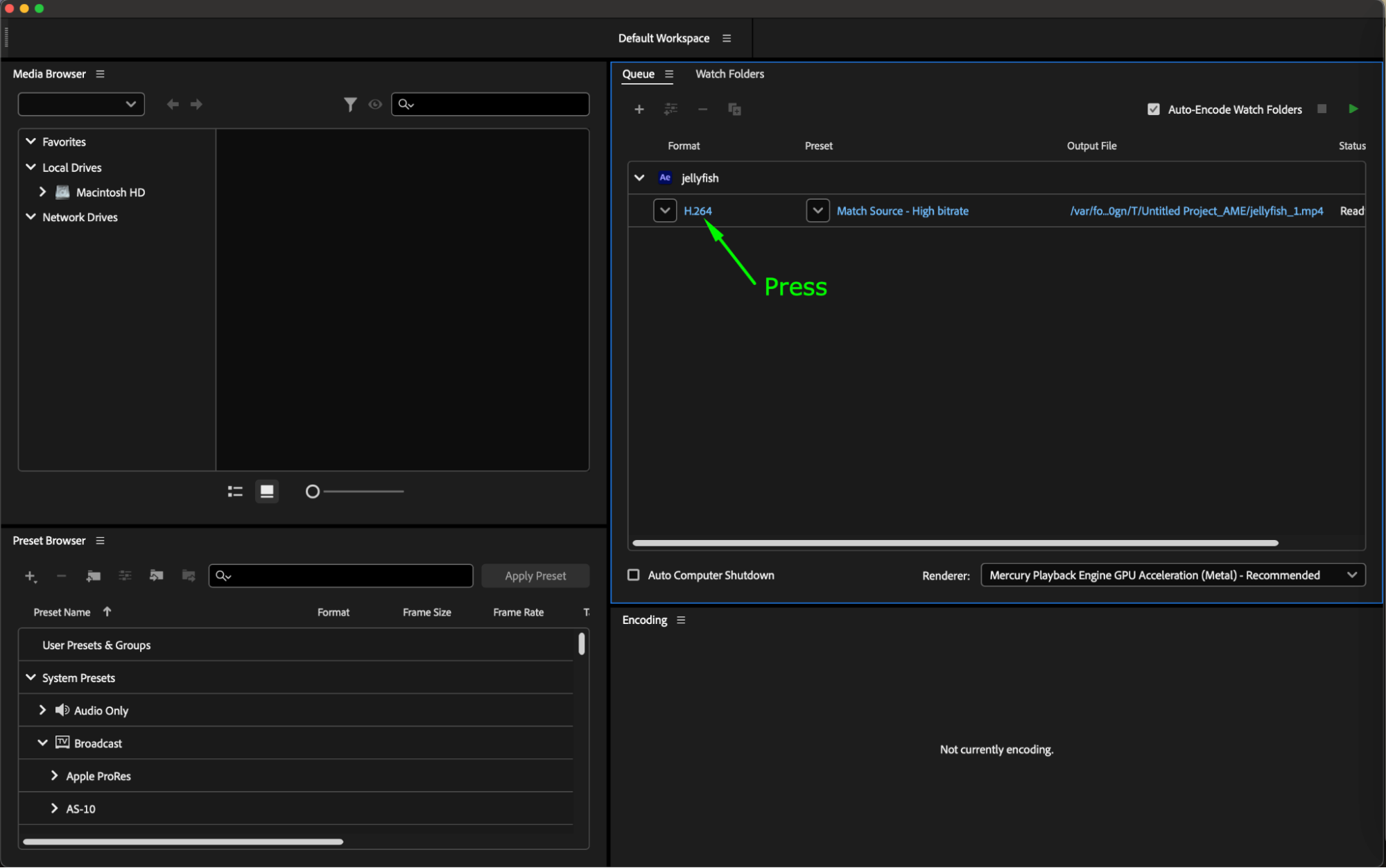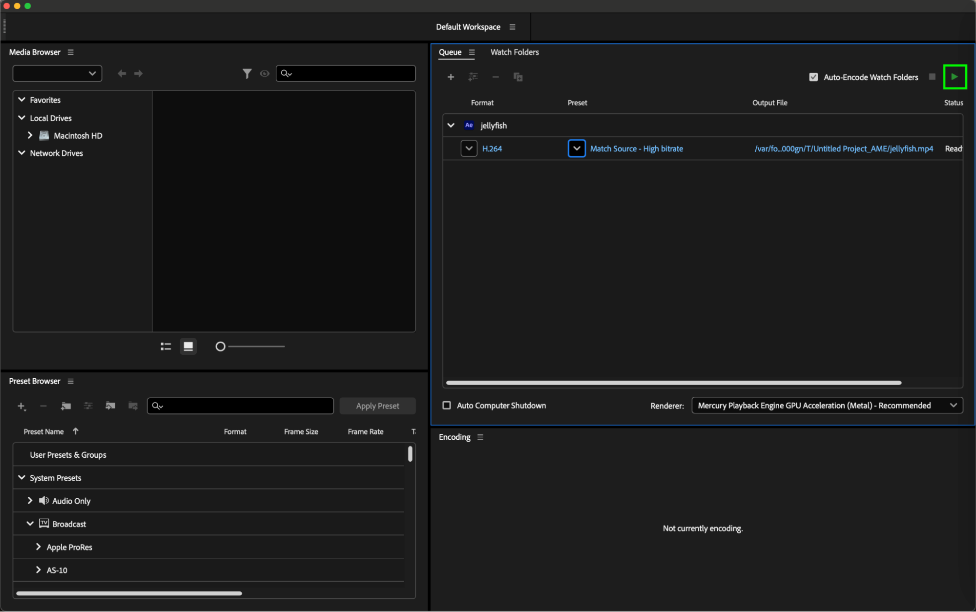 Once all settings are configured to your satisfaction, simply click on the “Start Queue” button (or press Return) in Adobe Media Encoder to commence the export process. This action initiates the rendering of your After Effects composition into the H.264 format according to the specified parameters, allowing you to generate the final video file ready for distribution or further post-production tasks.