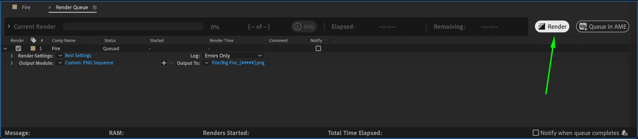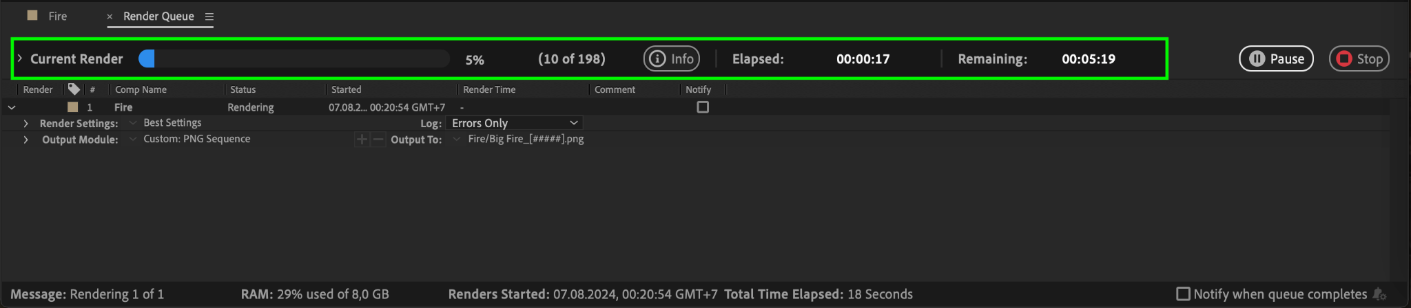 Once you’ve set all your preferences, click the “Render” button in the Render Queue panel to start the export process. After Effects will begin rendering each frame as a separate PNG file. You can monitor the progress through the Render Queue, which shows you the estimated time and completion status.