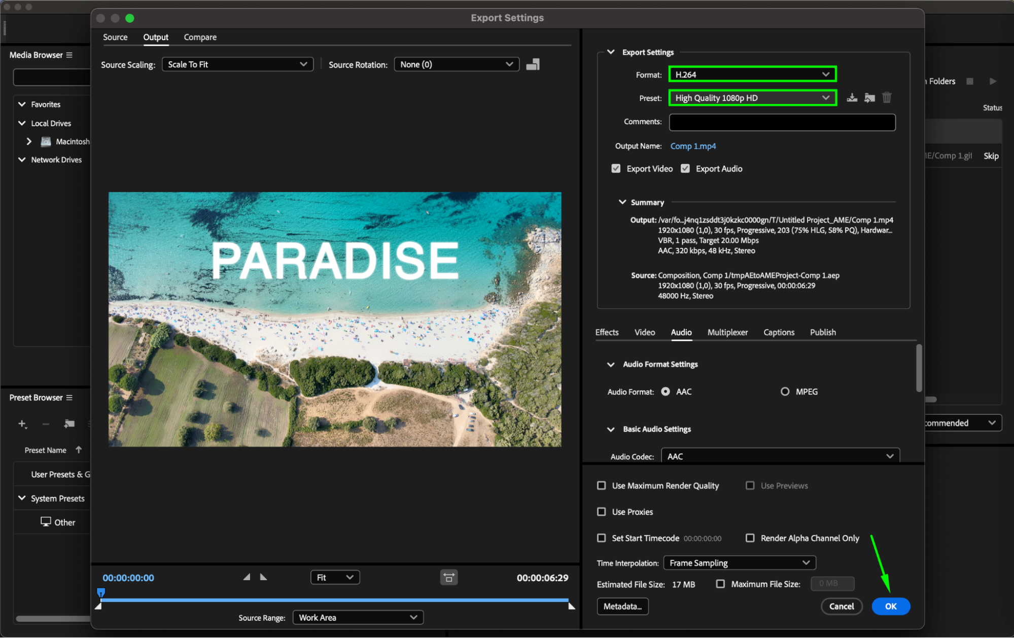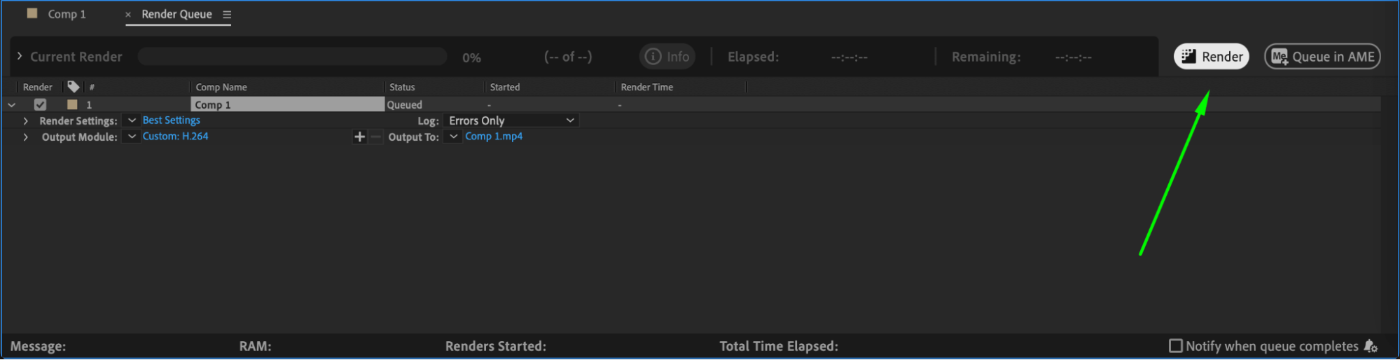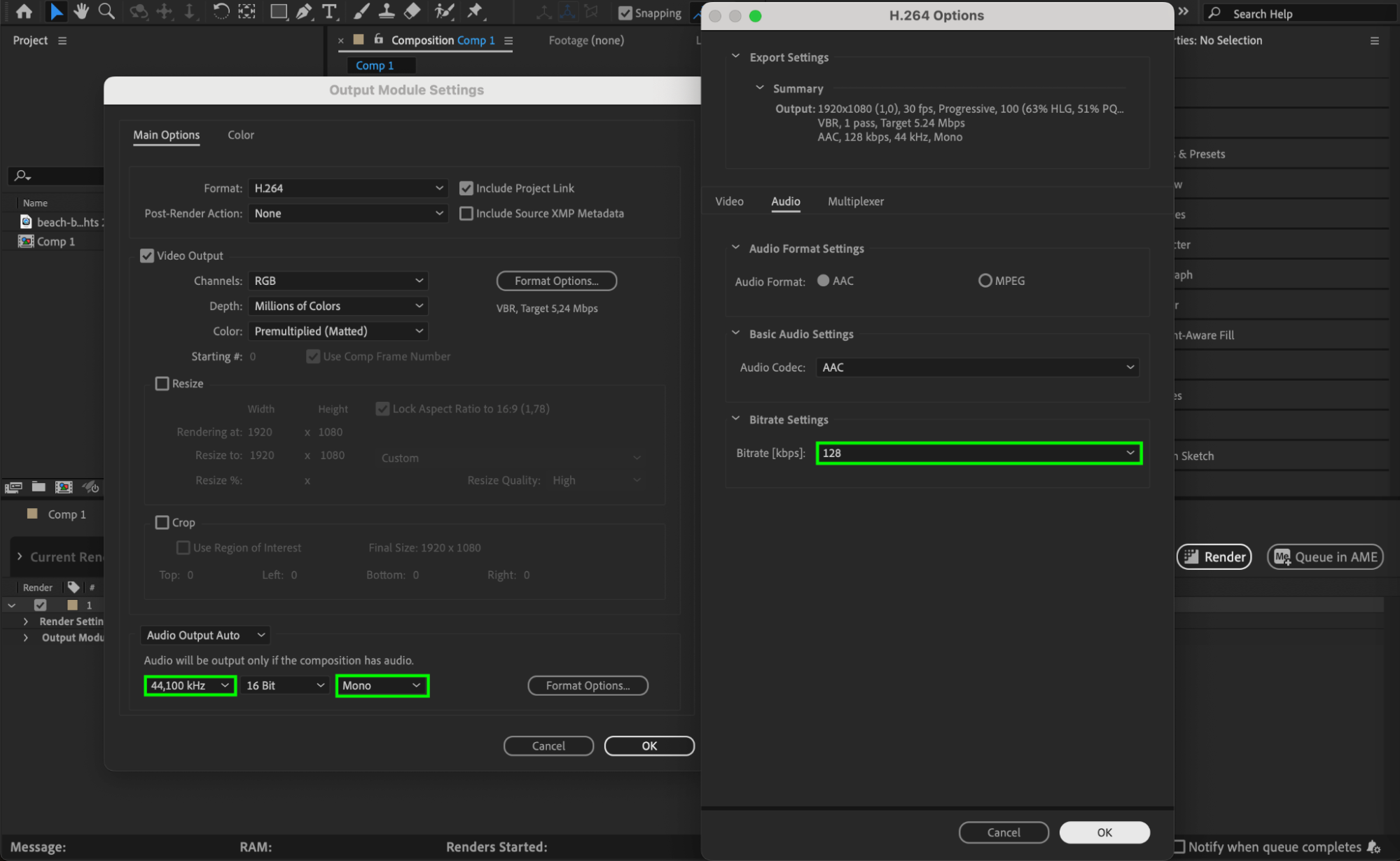 Choosing the correct format is key to keeping file sizes small. H.264 (MP4) is one of the best formats for compression while maintaining visual quality. Go to Composition > Add to Render Queue, then click on the Output Module and select H.264 as the format