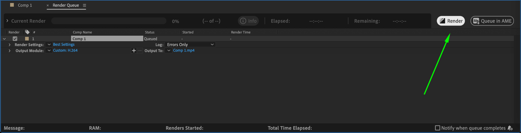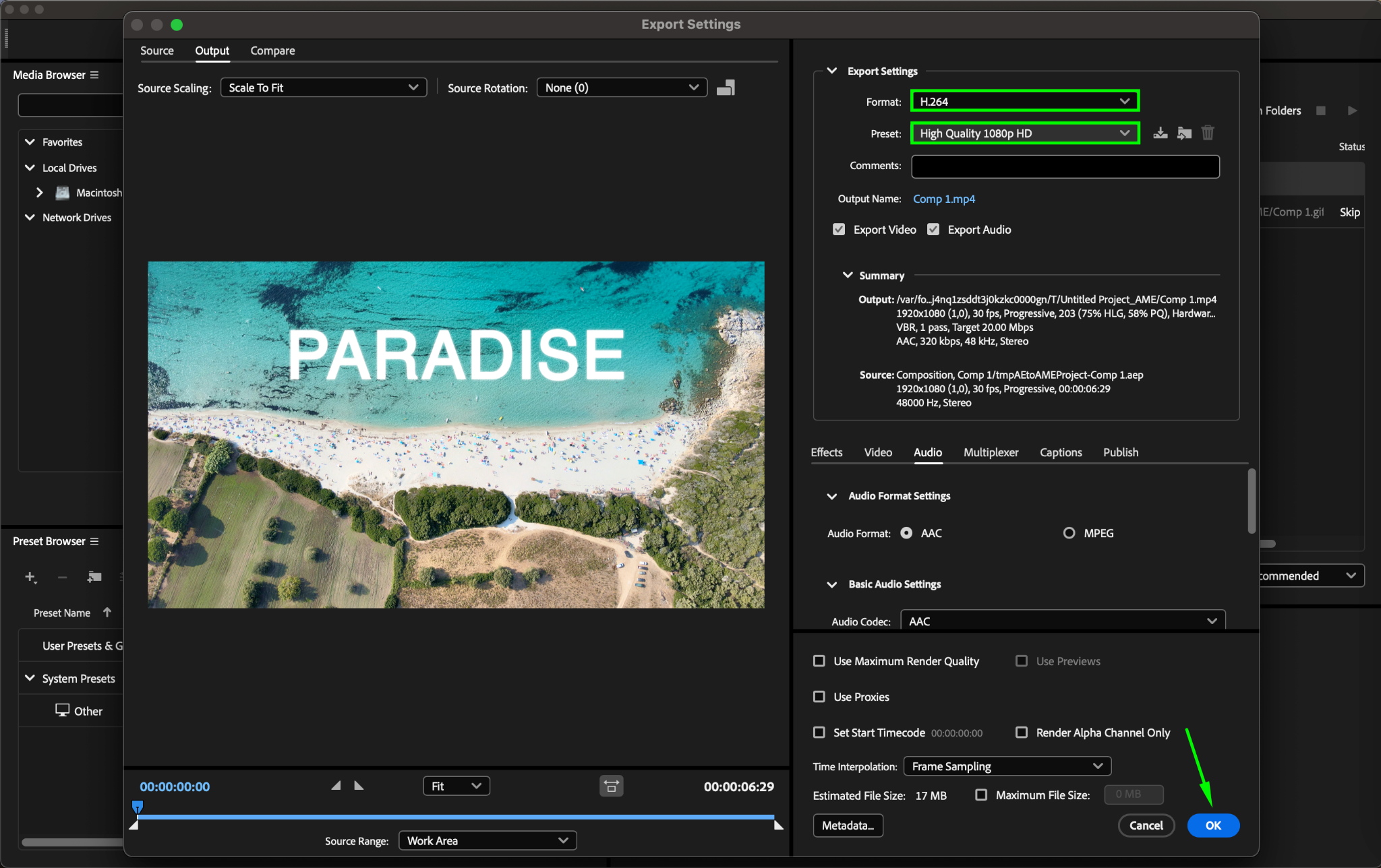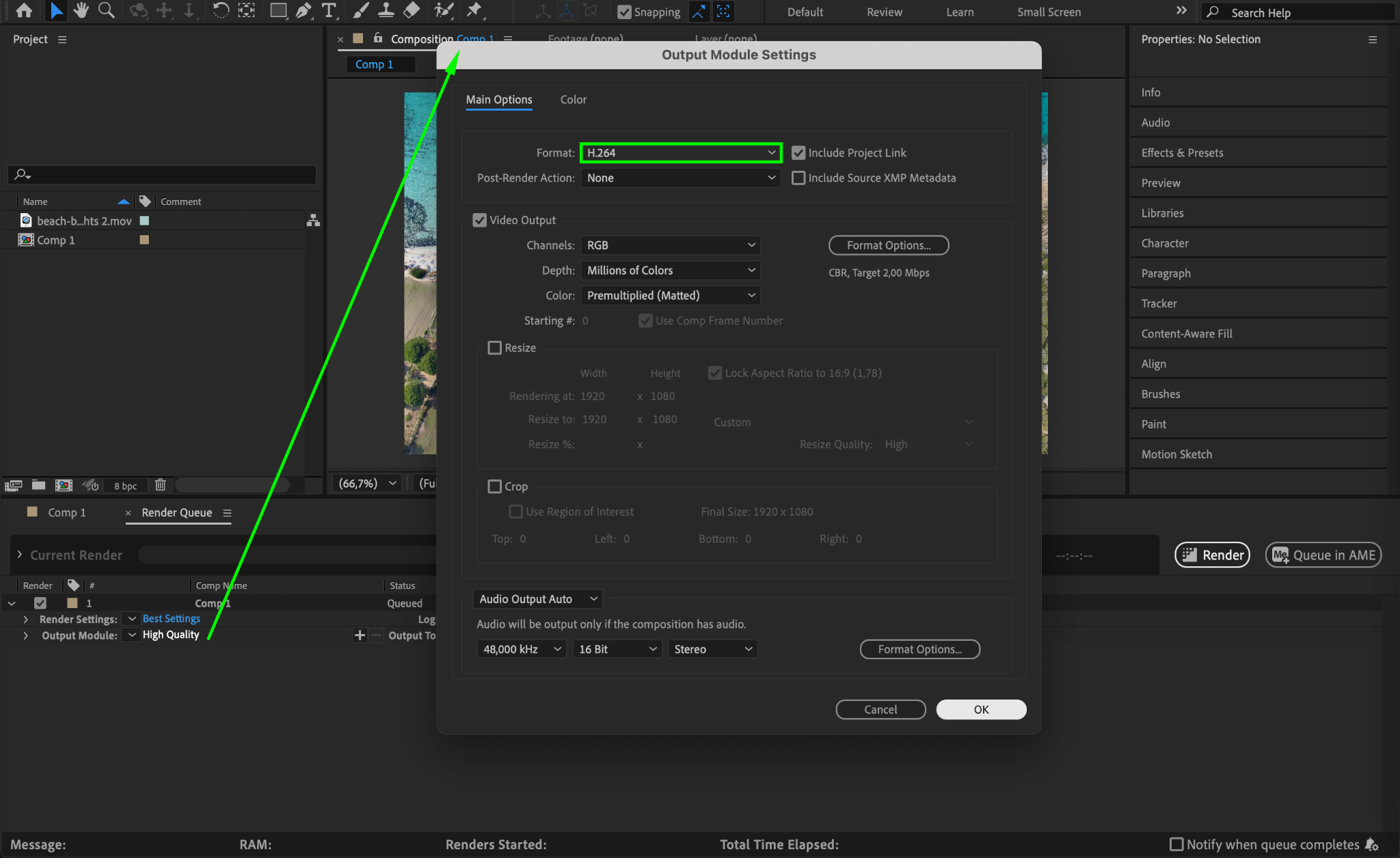 Choosing the correct format is key to keeping file sizes small. H.264 (MP4) is one of the best formats for compression while maintaining visual quality. Go to Composition > Add to Render Queue, then click on the Output Module and select H.264 as the format.
